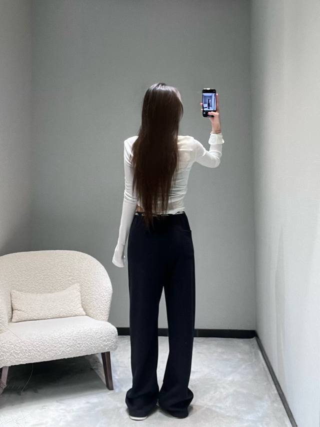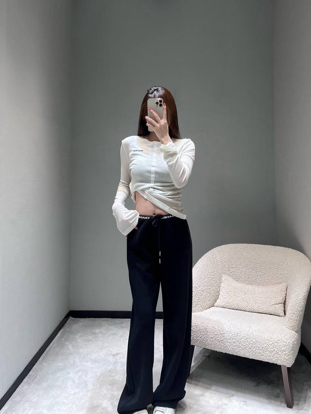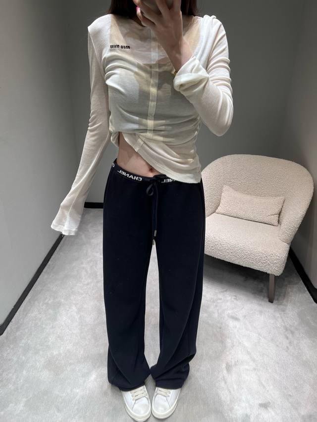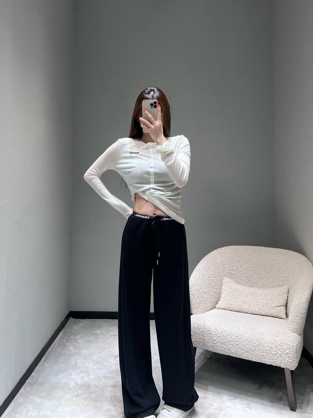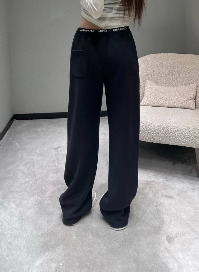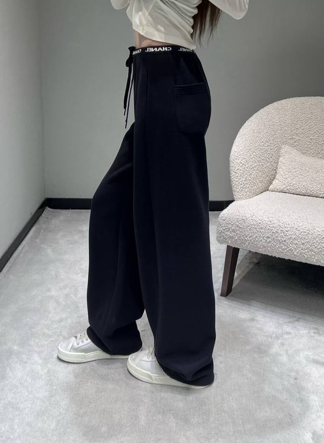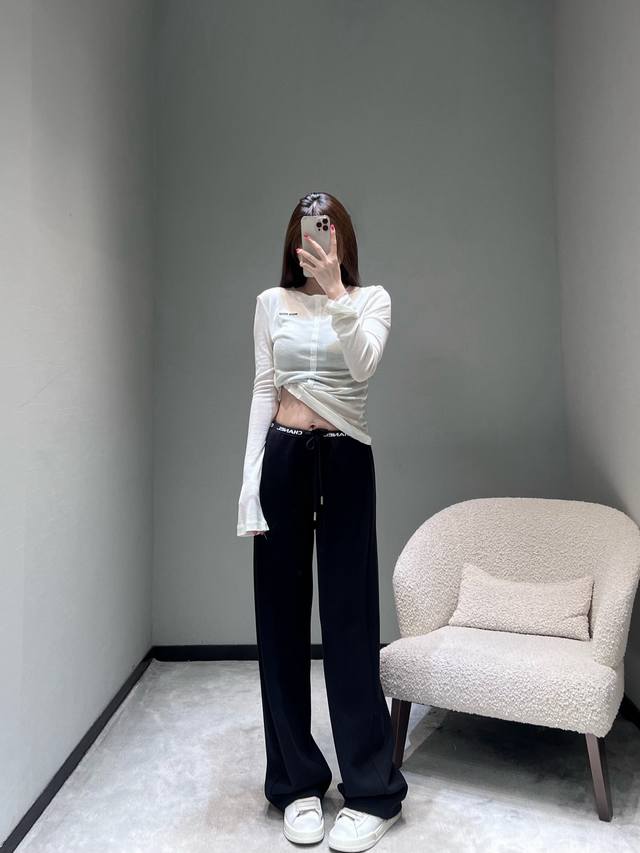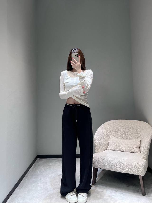 Chan*1 The 2025 ready-to-wear collection features a logo letter webbing embellishment at the waistband, exuding a sophisticated and easily recognizable look with its simplicity. The drawstring design allows for easy waist adjustment, and the metal details at the drawstring ends add a touch of refinement. The silhouette is a currently popular wide-leg style with a beautiful drape. SML DDD