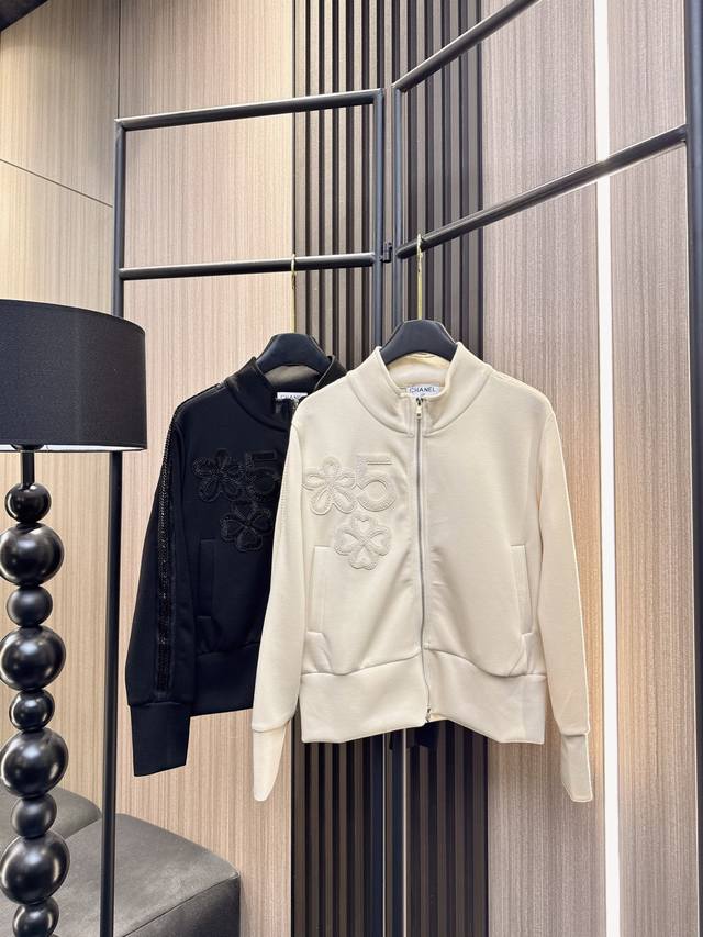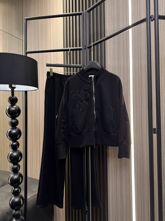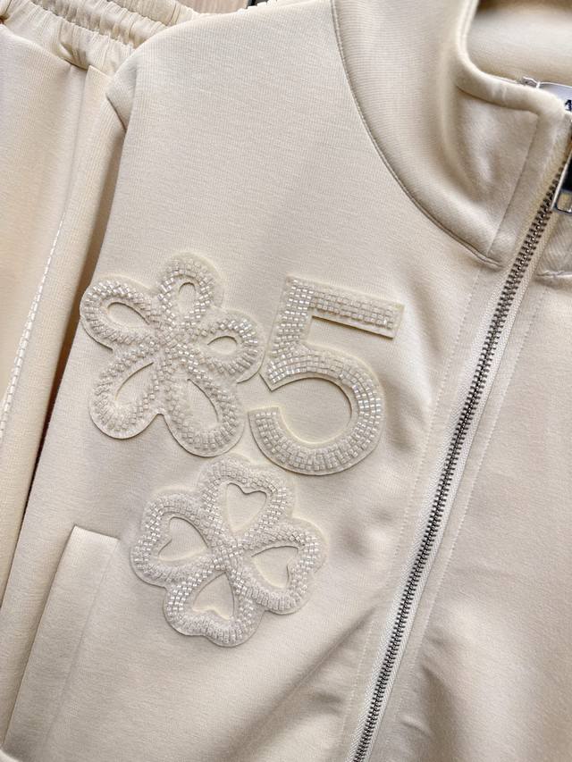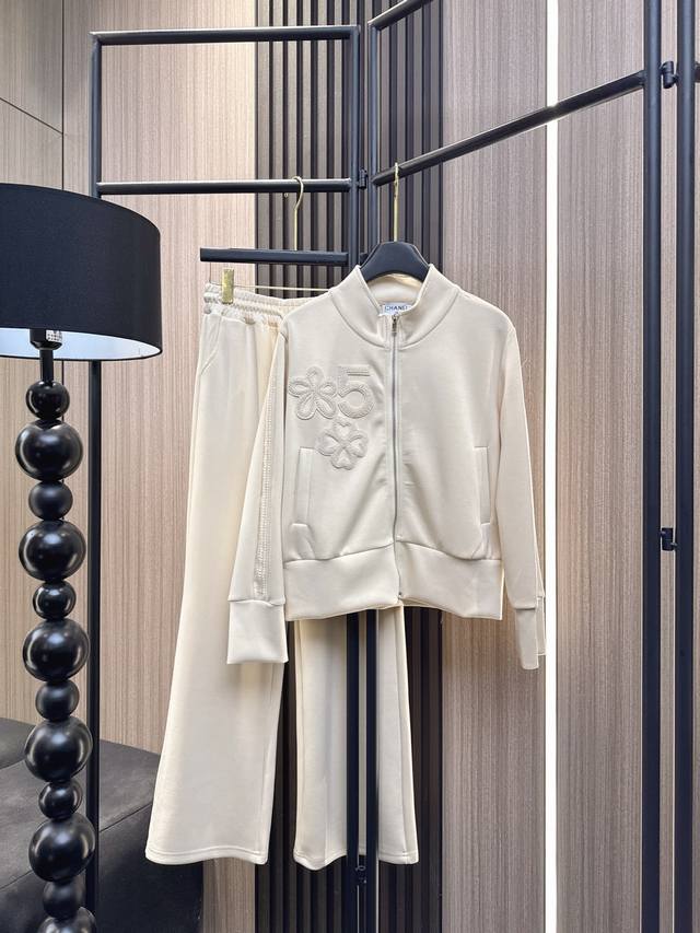 Chanel 2025 Autumn/Winter New Set - Chanel-inspired beaded floral set. Exquisite stand-collar long-sleeved top with elastic waist drawstring trousers. Handmade beaded floral embellishments on the chest add a touch of elegance. Comfortable and loose fit, flattering and slimming. Great value set price! Effortlessly create a sophisticated look. Available in sizes S, M, L, D.