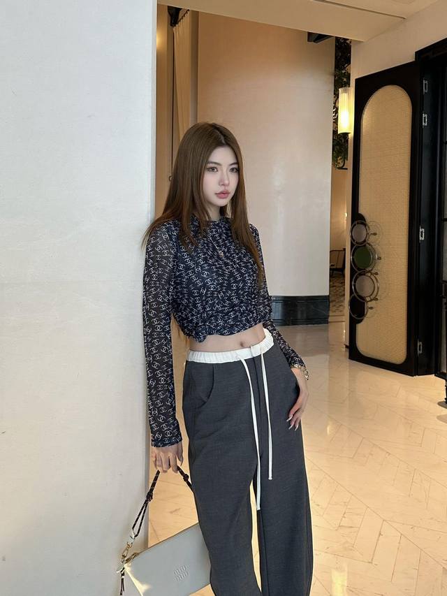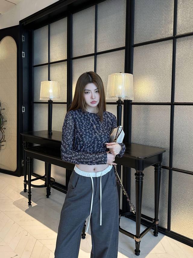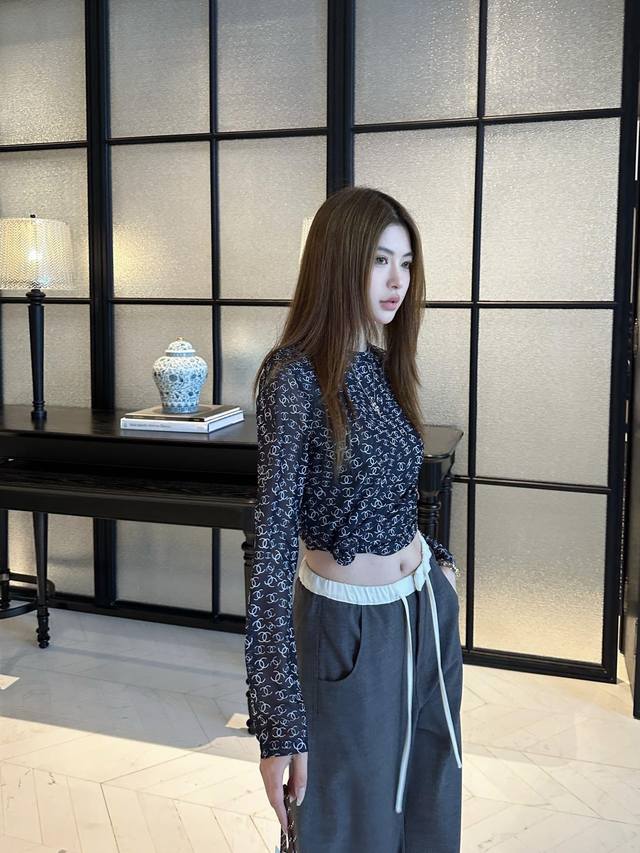 Chanel double C printed mesh bottoming shirt is a versatile daily item. The round neck close-fitting version makes the upper body look slim and elegant. The classic double C full print has a hazy and high-end feel. The upper body is full of royal sister temperament. It is very good to wear it alone as an inner layer and looks good with any combination. Sml