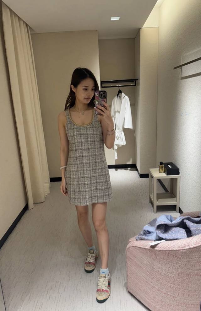 Chanel's new 2015 Early Fall Woven Hemmed Vest Dress. This dress features a super-heavy neckline, elegantly embellished with a gold-thread hem, complemented by the double-C engraved round buckle, creating a rich, layered design. This elegant, stylish, and sophisticated look is the top choice for a sophisticated look. The jacquard silk lining is featured on the top. One color available. Sml