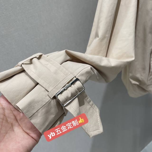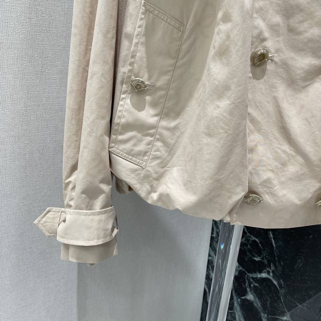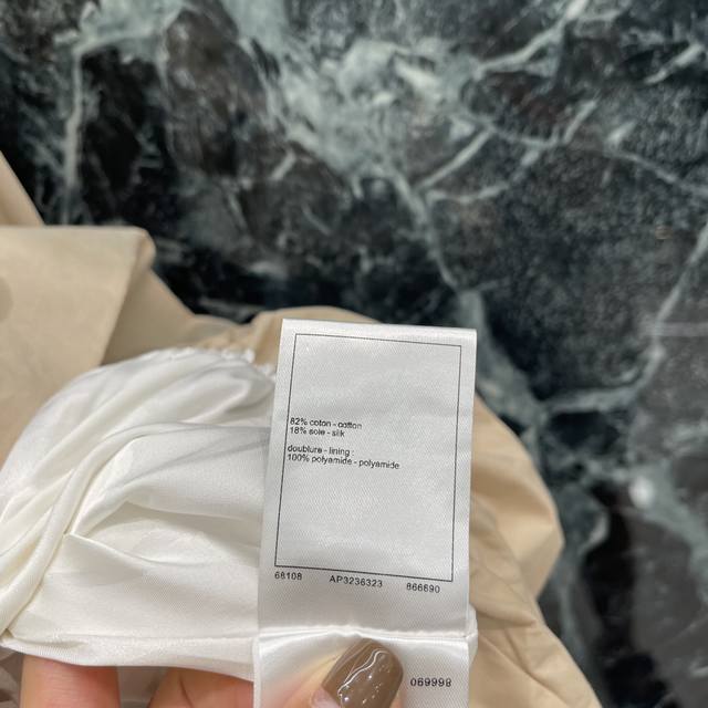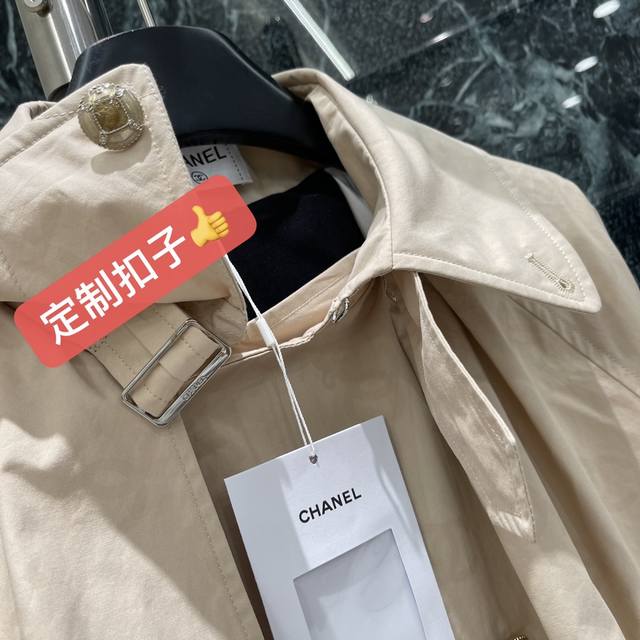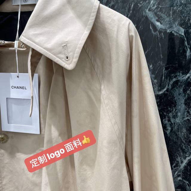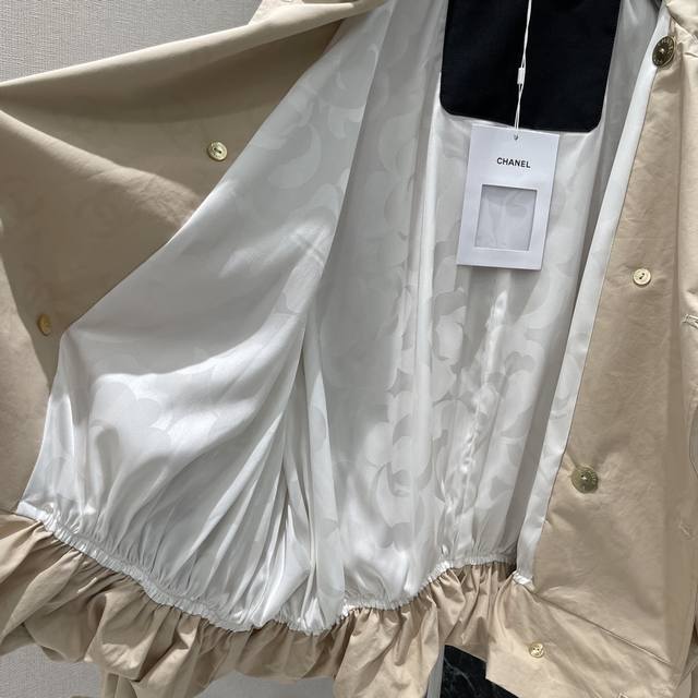 Chanel's new autumn/winter 25 short trench coat with a subtle jacquard logo. This coat offers a subtle, understated luxury and a sophisticated feel. The dropped shoulders and wide A-line silhouette are versatile and versatile, with a puffy, pleated hem and a stunning camellia jacquard lining. One color in stock. Sml