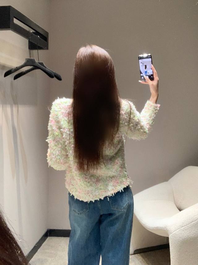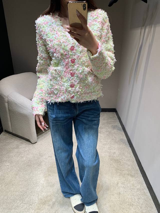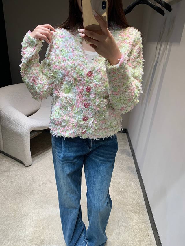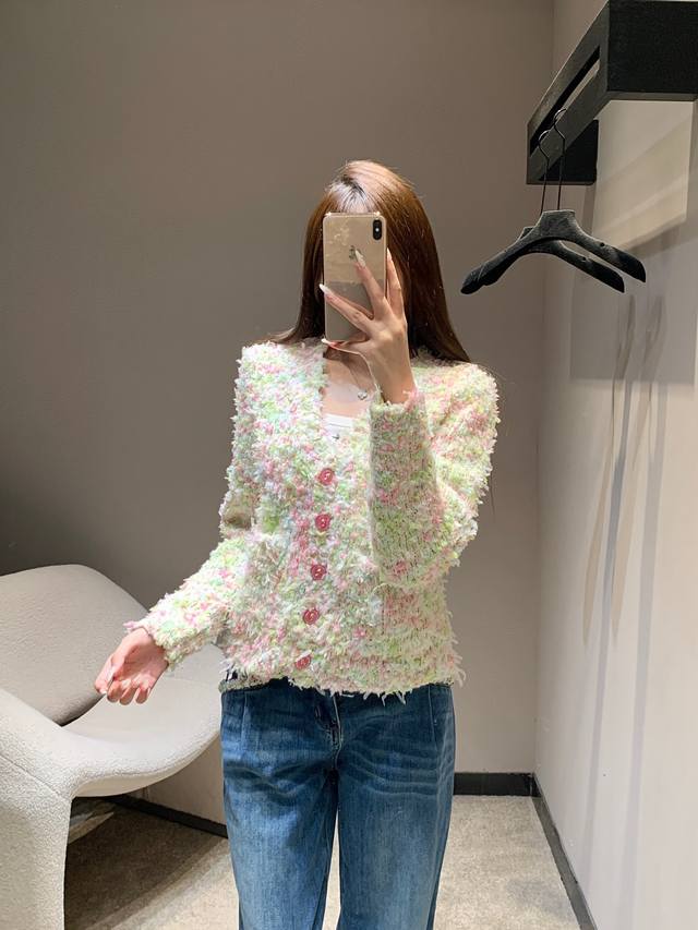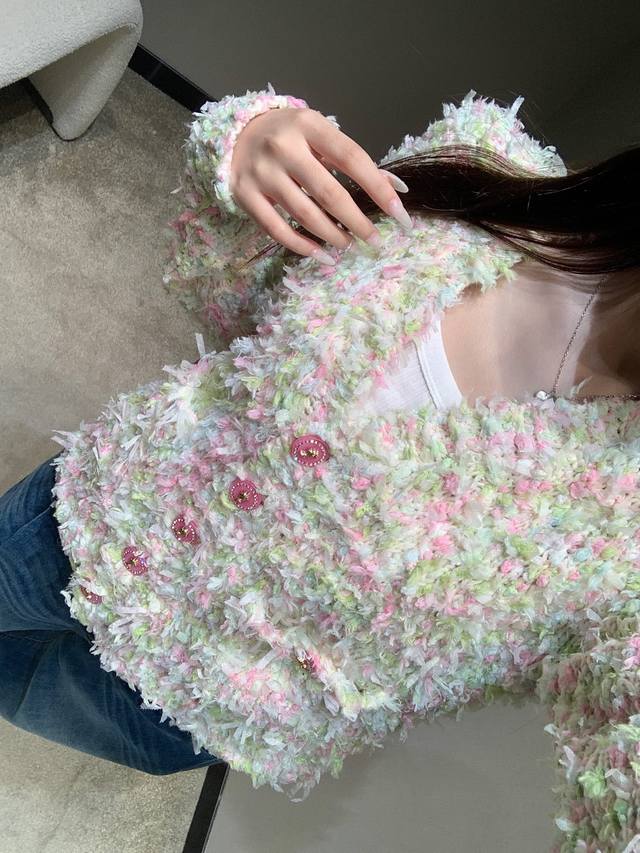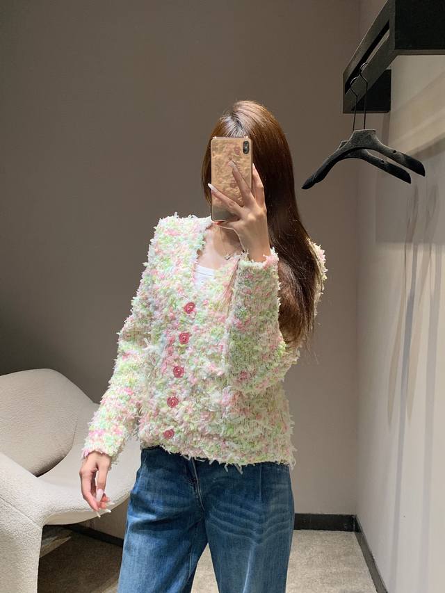 Chan*L 25K High-End Handcrafted Series Macaron V-Neck Knit Cardigan | Exclusive High-Quality Production! Blending macaron shades like cherry blossom pink, mint green, and cream white, every inch of the fabric reveals the delicate texture of hand-knitting. Ruby-colored buttons on the placket and pockets, and a clean, short V-neck design cleverly elongate the legs, creating a flattering three-to-seven proportion when paired with high-waisted trousers or skirts. The relaxed, dropped-shoulder silhouette is flattering for all body types and can be worn alone or layered. Available now in sizes S, M, L, D.D.