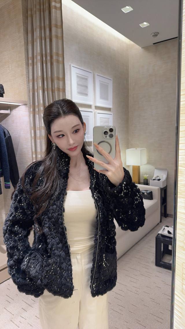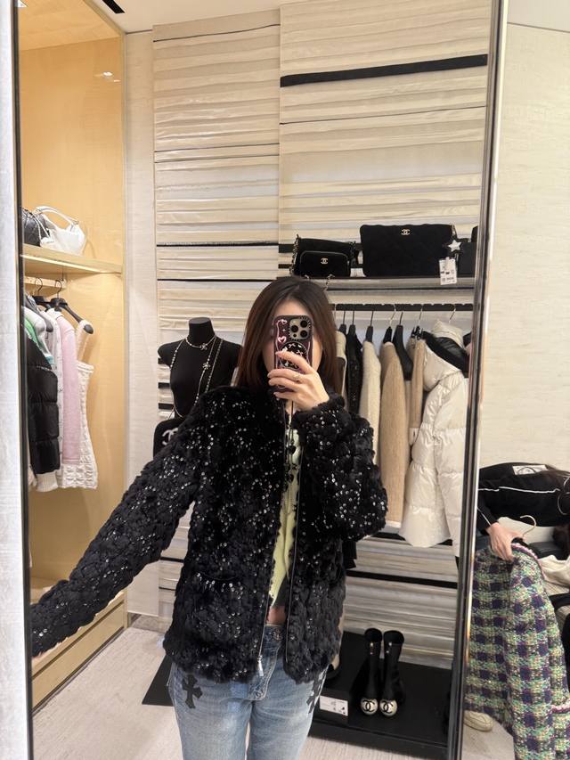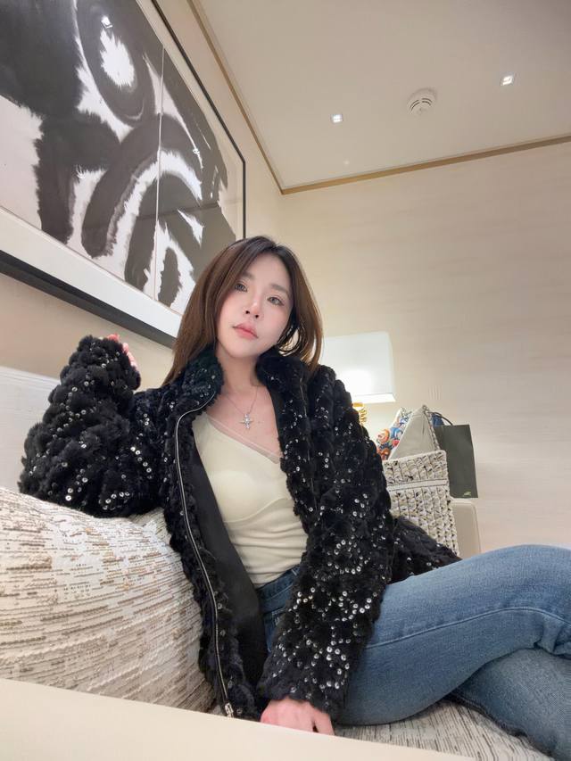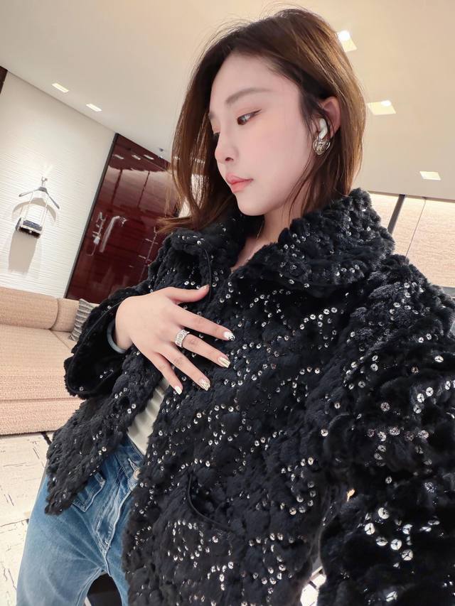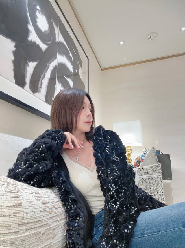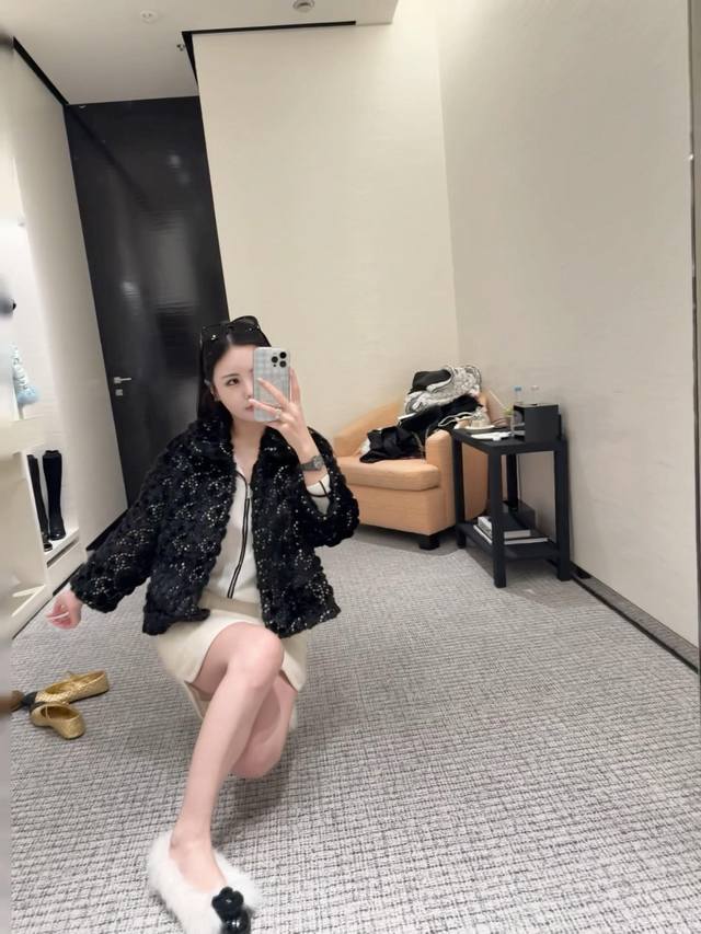 Chan*L 25N Coco Neige Ski Collection Black and White Sequined Fuzzy Textured Jacket | Exclusive Yb Development! High-Quality Production! The fluffy plush base is covered with contrasting black and white textured patterns, each inch like a crumpled snowflake wrapped in tiny starlight; sequins adorn the texture, diffusely reflecting a cool luster as you walk, effortlessly shimmering with a relaxed vibe. The cropped cut accentuates the high waistline, with a stand-up collar and turn-down collar design, and black trim outlining the silhouette, perfectly balancing sweetness and coolness with the relaxed feel of a "rich heiress out and about." Available now in S, M, L, DDD sizes.