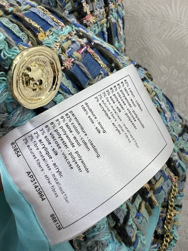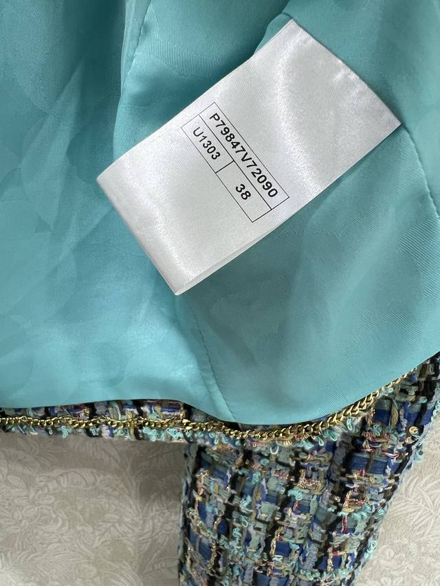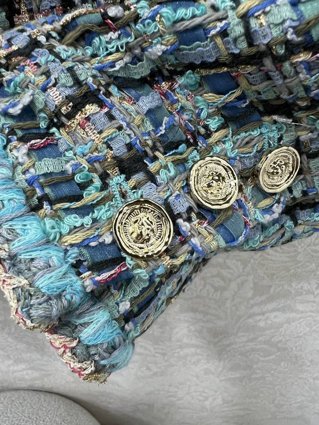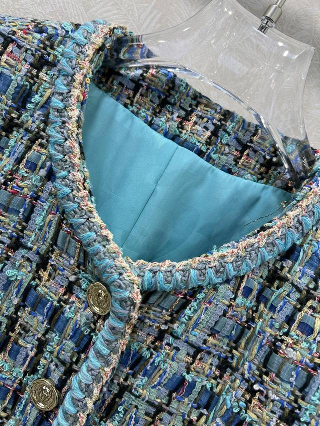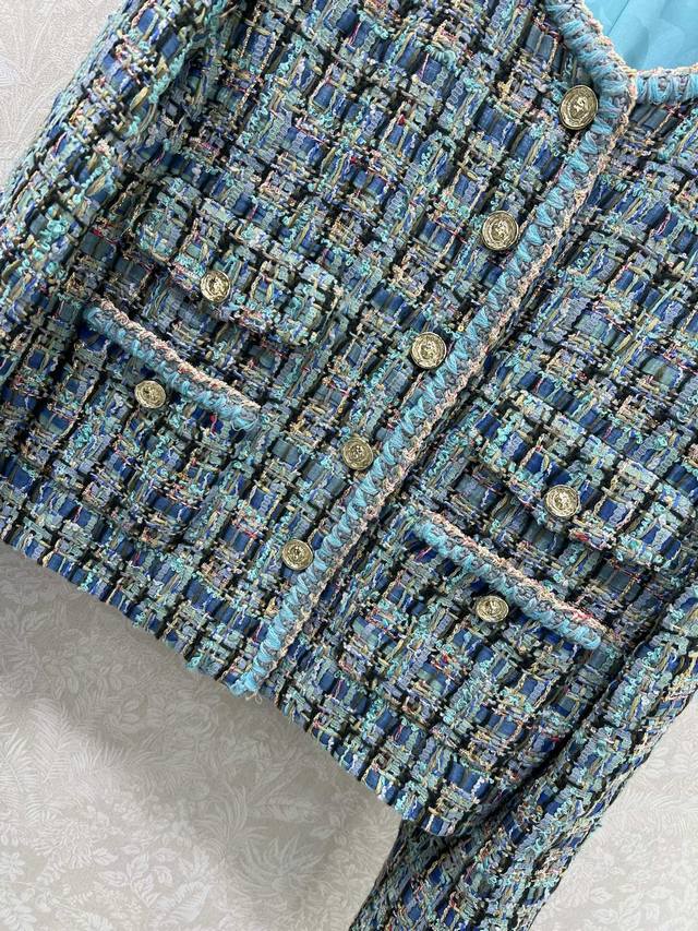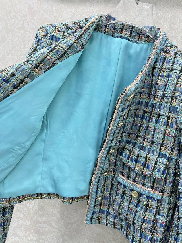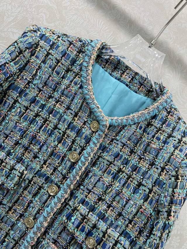 Chan*L25's new woolen, tied-hem dress jacket is now shipping in its high-volume version. The exquisite and elegant peacock blue combination is beautiful even in plain color, with noticeable wool texture visible to the naked eye. The high-quality, coarse, checkered tweed fabric embodies a ladylike style. The single row of heavily engraved round buttons on the front is exquisitely crafted, featuring a vibrant, elegant aqua-blue weave interspersed with colorful threads. The refined weave features a bound hem extending from the neckline to the front, highlighting the brand's rich, layered design. It exudes elegance and style, creating a stylish and sophisticated look. Available in sizes 36, 38, and 40. Available in three solid colors. Smlb.