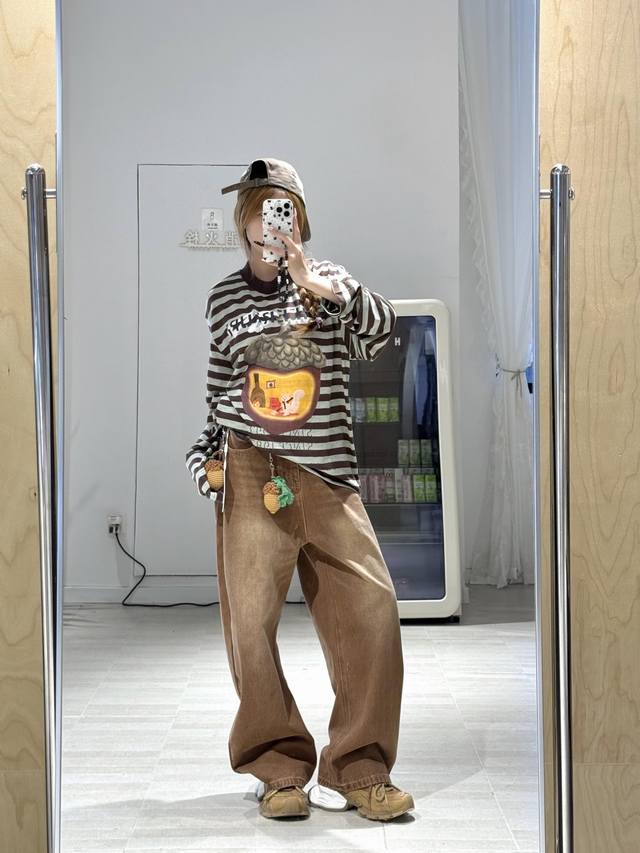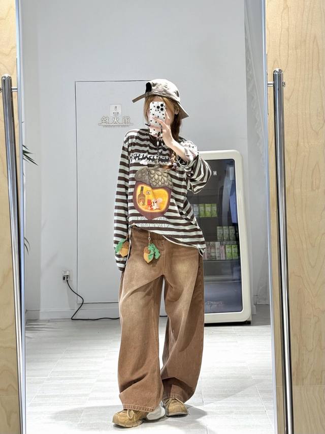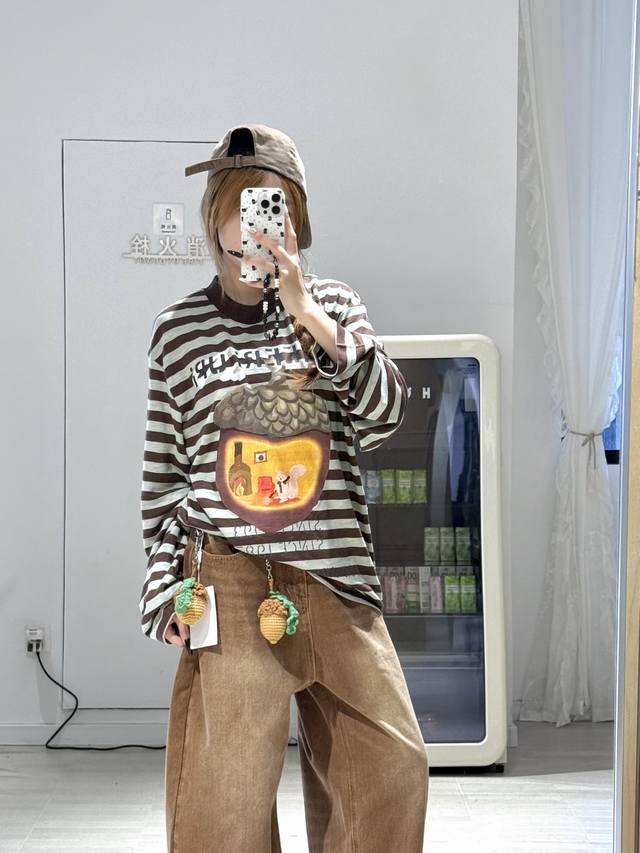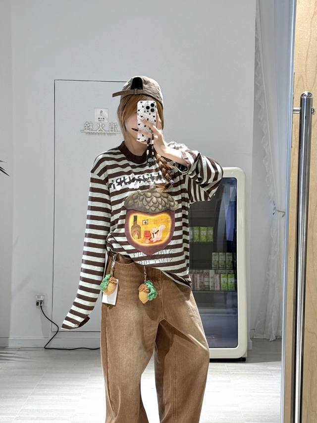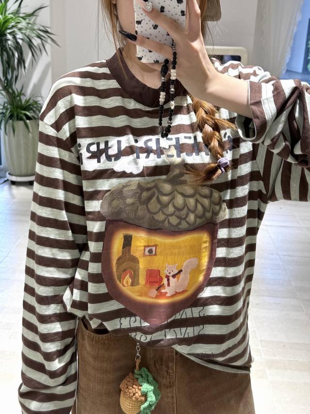 Cheeri Up*25Fw Early Fall New Squirrel's Acorn House Loose Striped Long-Sleeve T-Shirt | Exclusive High-Release Edition! The striped design is classic and versatile. The adorable acorn house pattern on the chest seems to hide a healing little world, instantly brightening up your outfit. The loose fit is super comfortable and looks great with casual pants for a casual street style or a lace skirt for a sweet girl look. It easily injects energy into your daily outfit and adds fun and vitality. Available now Sml