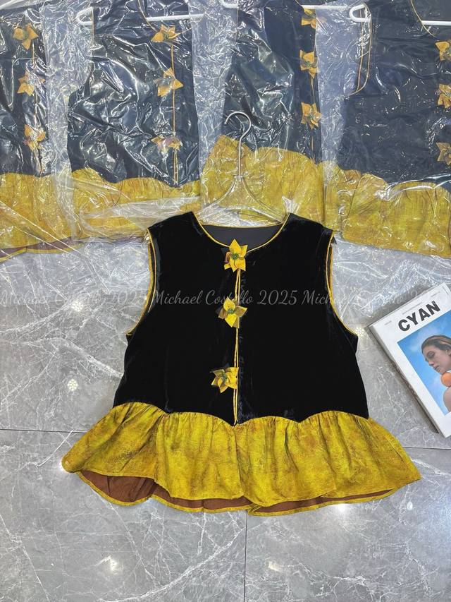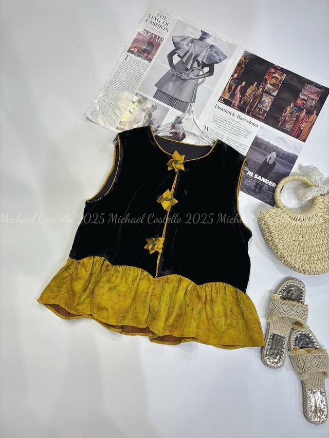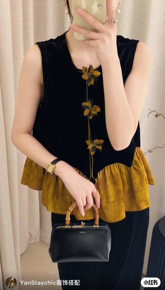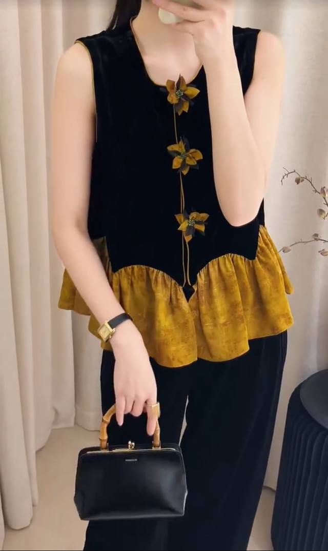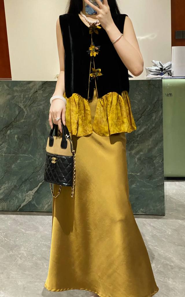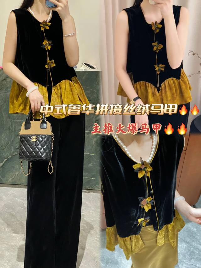Chinese style luxury patchwork vest, classic black velvet, calm and elegant, three-dimensional flower decoration, smart and unique, adding a touch of romance to the overall look, the yellow and brown patchwork ruffled hem is rich in layers and playful, outlining the graceful figure Smlxl