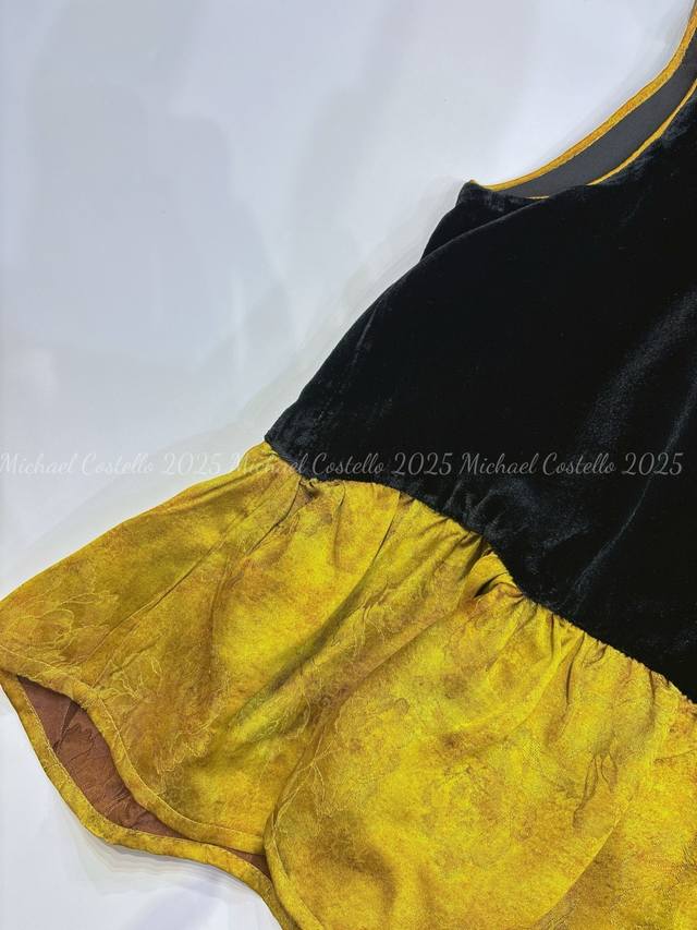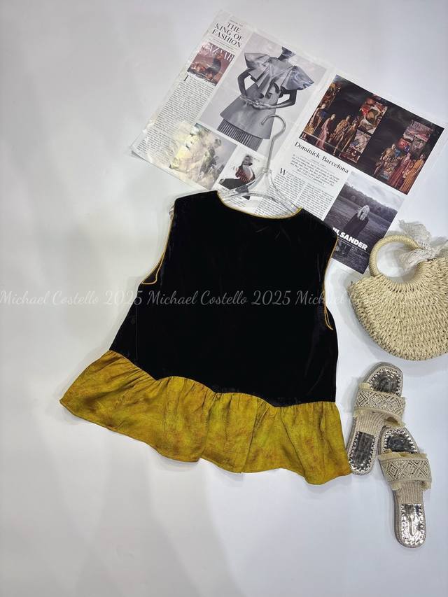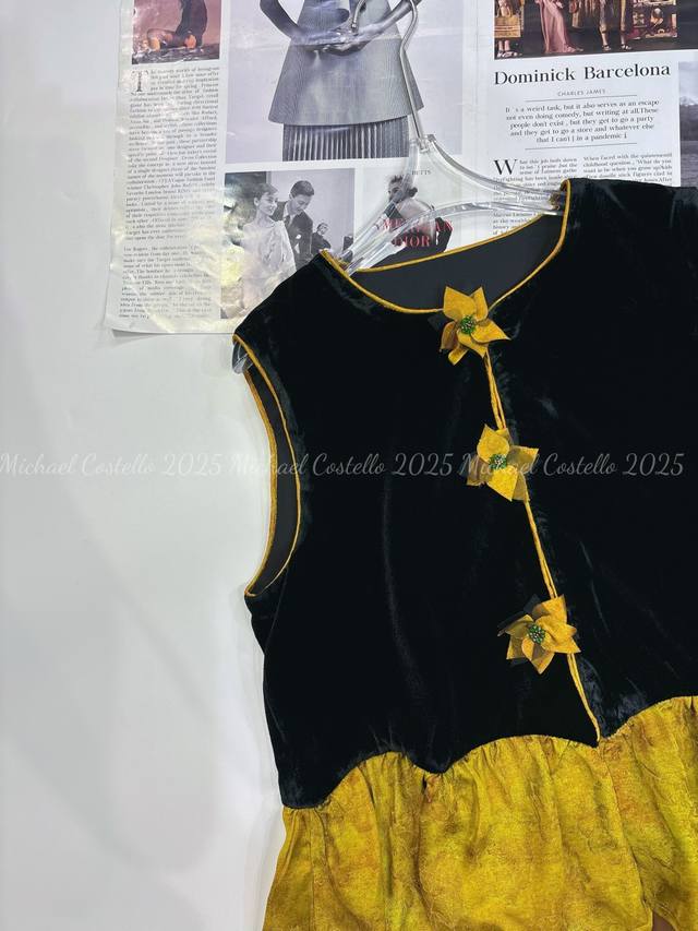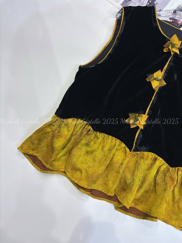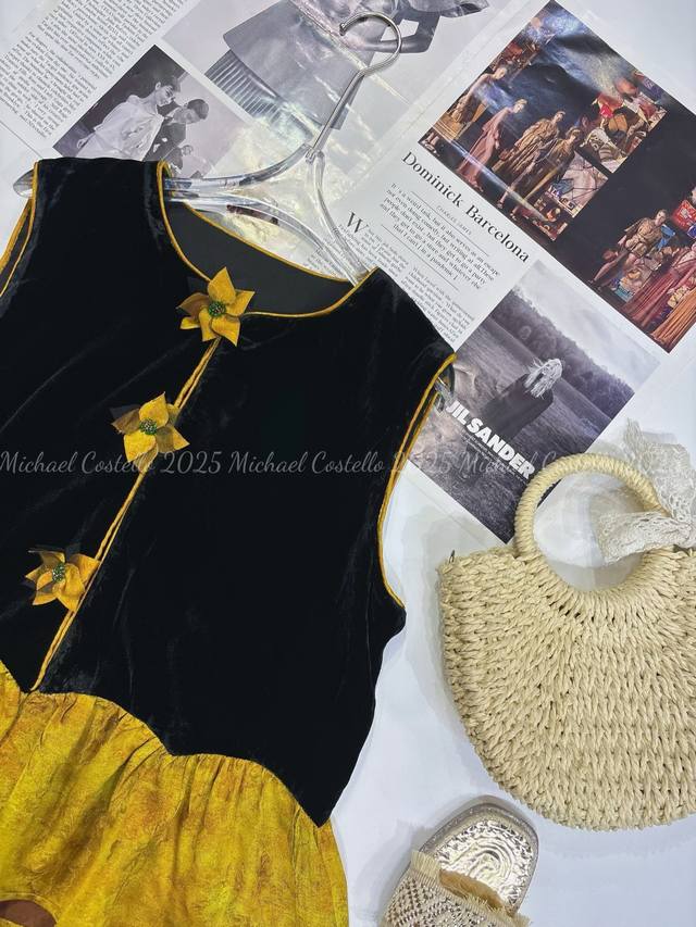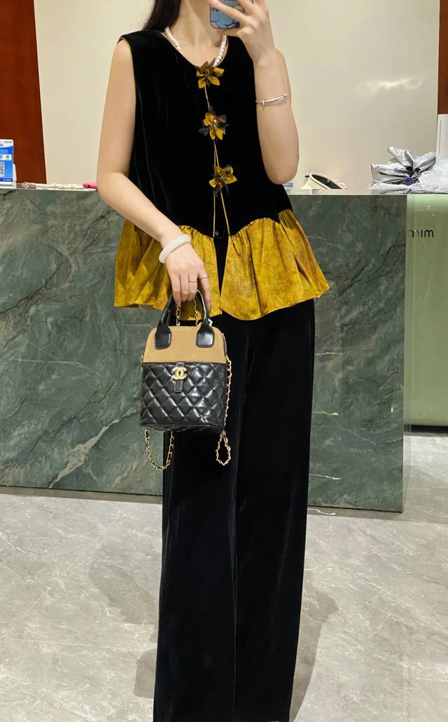 Chinese style luxury patchwork vest, classic black velvet, calm and elegant, three-dimensional flower decoration, smart and unique, adding a touch of romance to the overall look, the yellow and brown patchwork ruffled hem is rich in layers and playful, outlining the graceful figure Smlxl