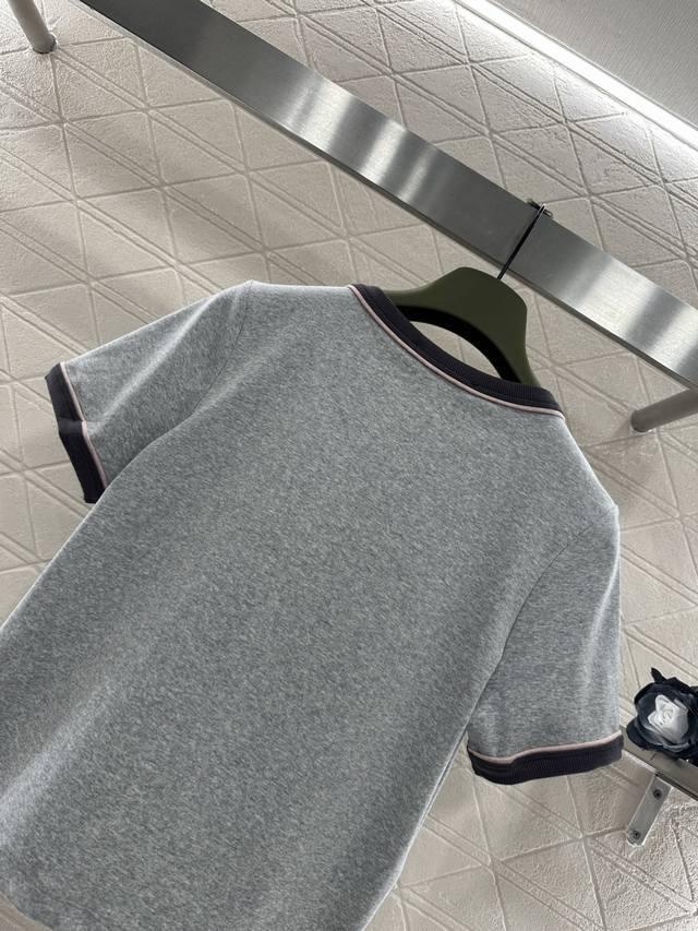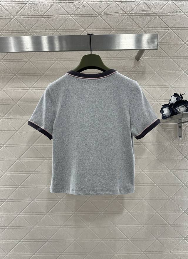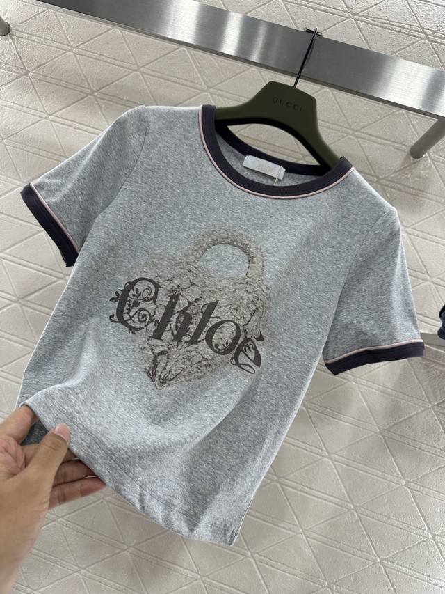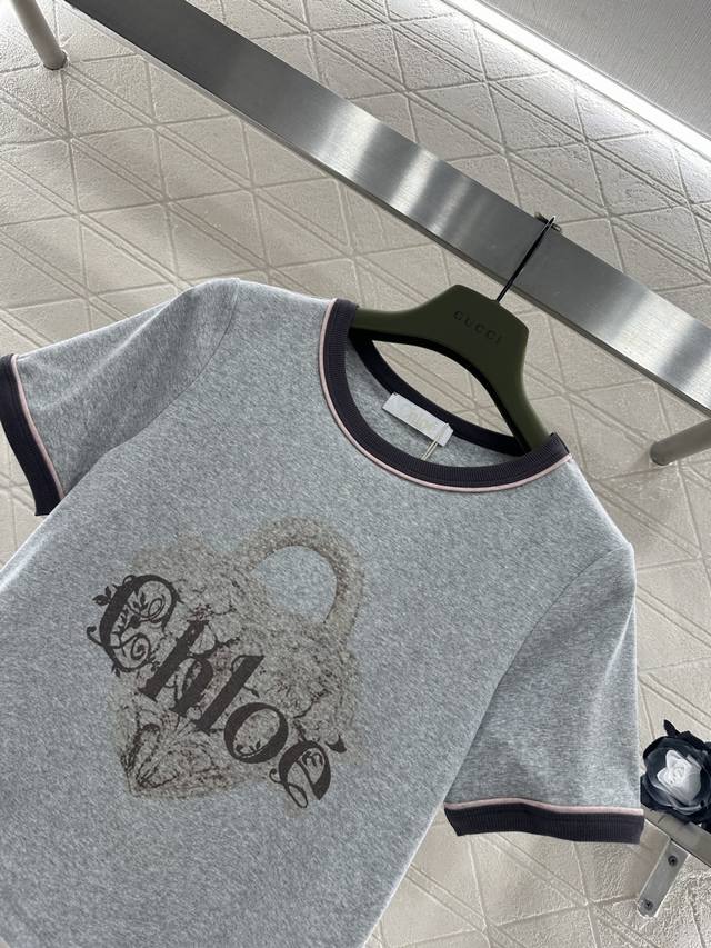 Chole*2025 New Arrival Ddd Short Color-Block Logo T-Shirt. Made of custom Yb twill cotton, soft and skin-friendly, comfortable and stylish. The short-sleeved T-shirt features a contrasting ribbed neckline and cuffs, with a light gray body for a fashionable and chic look. The chest is decorated with a printed logo and heart-shaped clasp, adding a youthful and playful touch. The short, fitted style makes it even sweeter and more charming. Custom fabric and accessories, please look for the high-quality grey version. DDD