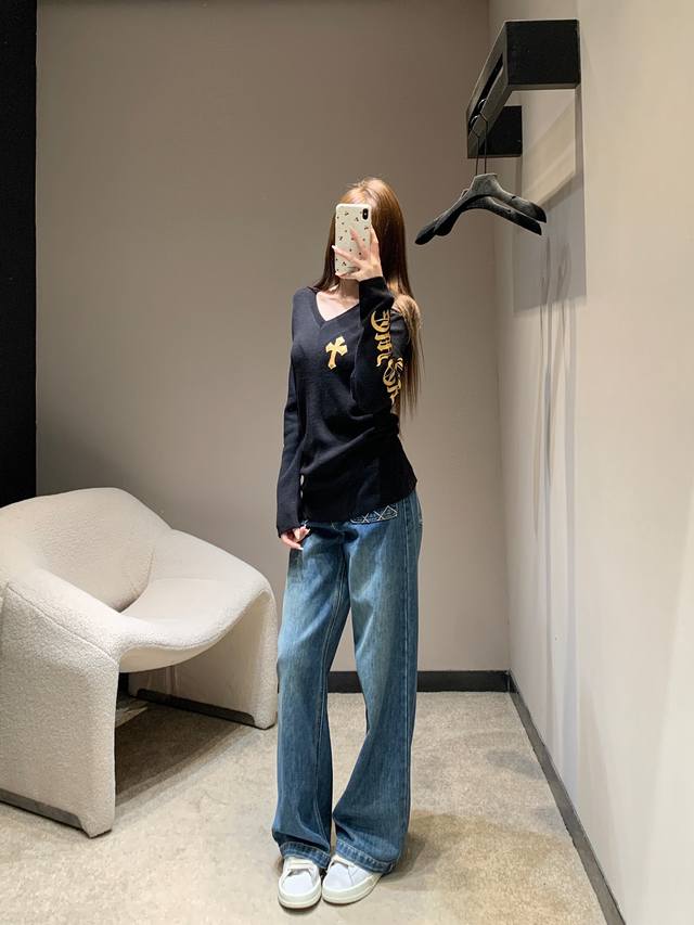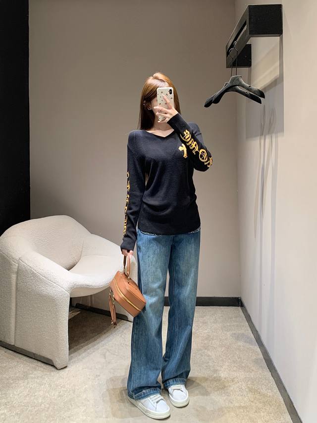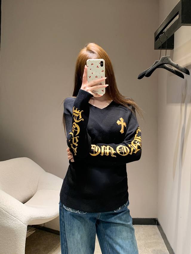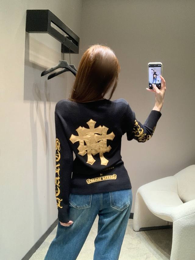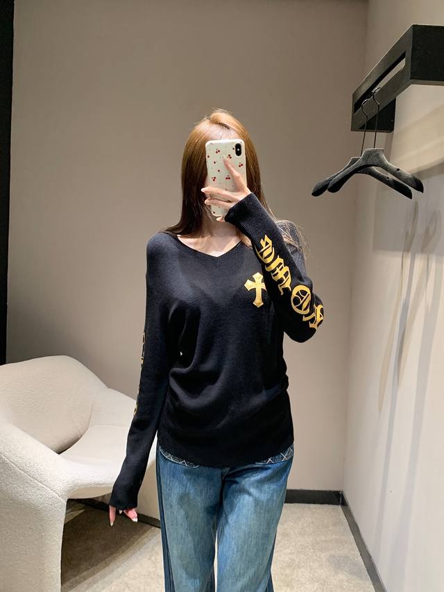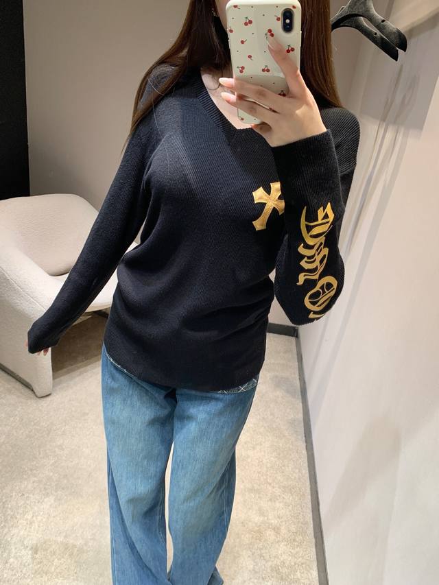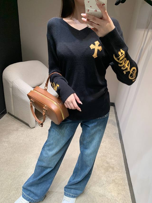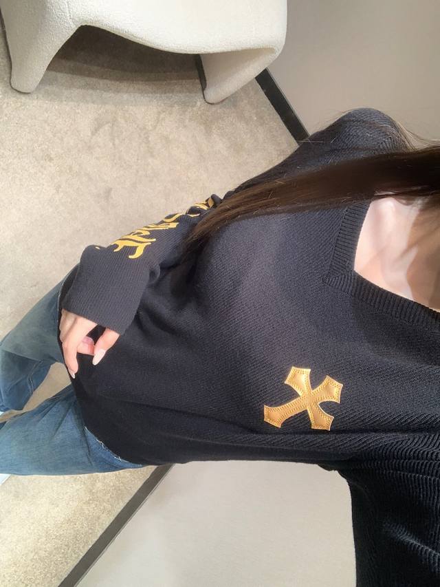 Chorme Heart* 26Ss Early Spring New Cross-Patterned Leather V-Neck Cashmere Knit Sweater | Exclusive High-Quality Production! The pure black cashmere knit has a naturally delicate feel. The V-neck and slim fit subtly accentuate the figure. A giant cross-patterned leather back and gold-stamped lettering on the sleeves add a touch of elegance. The soft yet structured cashmere fabric is gentle on the skin. The slim fit is versatile for layering or wearing alone. Layering with a cross necklace creates a edgy, edgy look, while pairing it with a biker jacket instantly transforms you into a high-street fashionista, unlocking countless cool styles. Available now in sizes S, M, L, D.D.