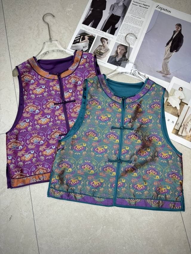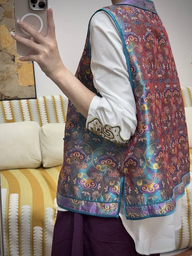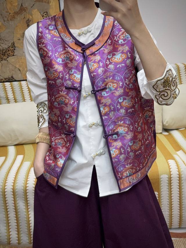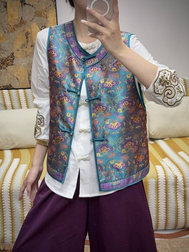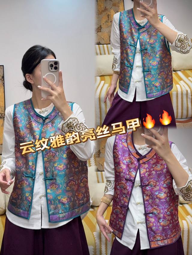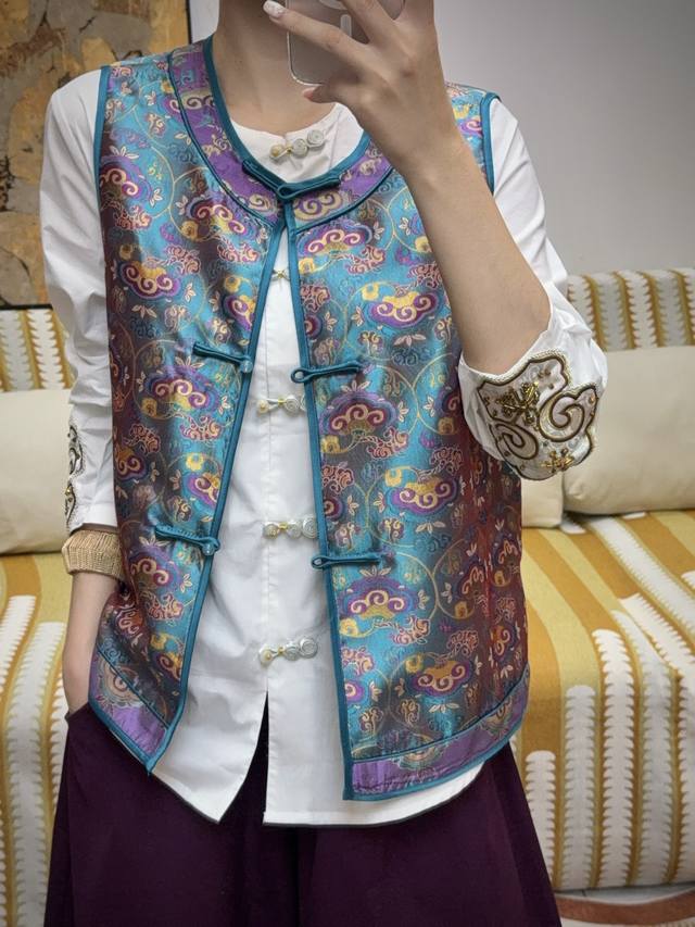 The main color of blue and purple is matched with orange and blue cloud pattern. The slim round collar and buttons show oriental charm. The silk blend is smooth and shiny. It can be worn inside or outside to show classic temperament. ~ Smlxl