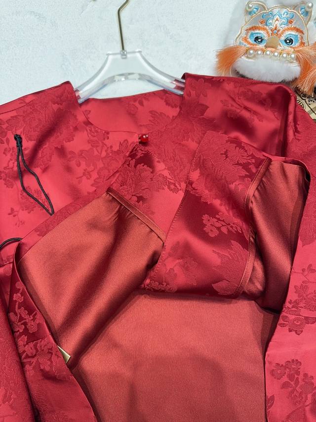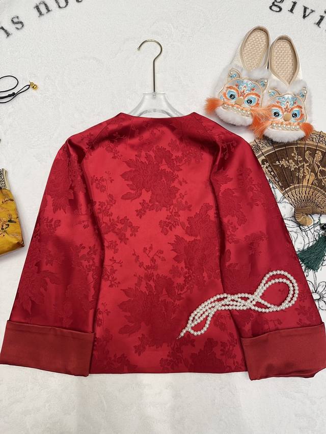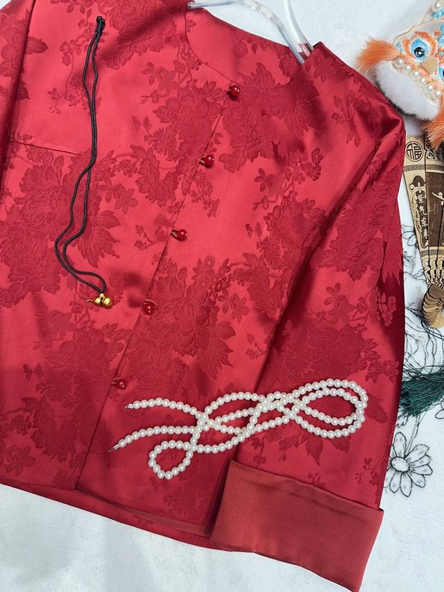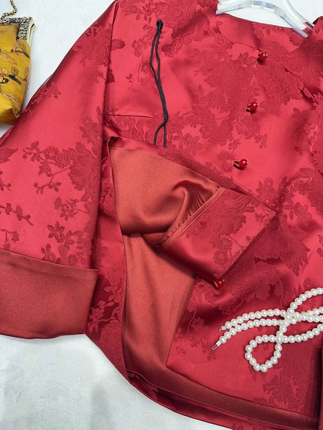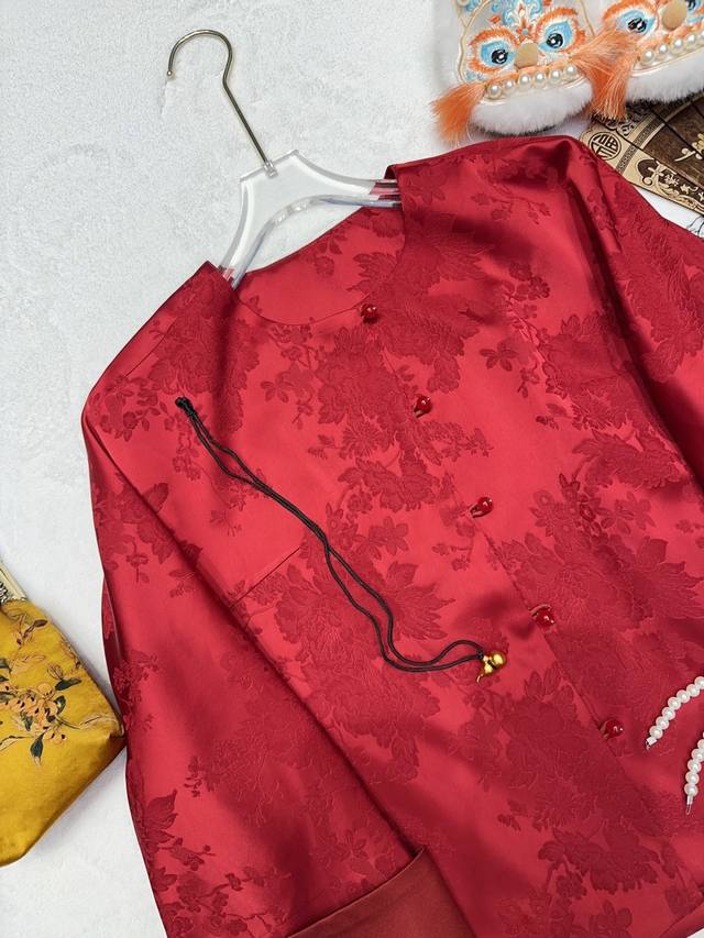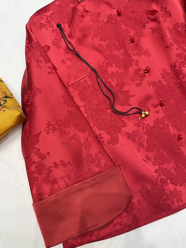 A luxurious red jacquard Chinese-style coat. The rayon red jacquard satin has a matte, luxurious feel, and the subtle floral texture hides understated elegance. It's understated yet instantly exudes sophistication. The rounded, lustrous agate buttons enhance the richness of the red tone. The stand-up collar and wide sleeves have clean, flowing lines. The satin drape feels wonderful to the touch, and it's comfortable and flattering to wear. It's the kind of wardrobe staple that's instantly sophisticated and grows more charming with time. It incorporates the elegance of Eastern aesthetics into every detail. Smlxl