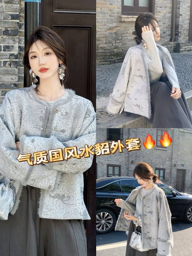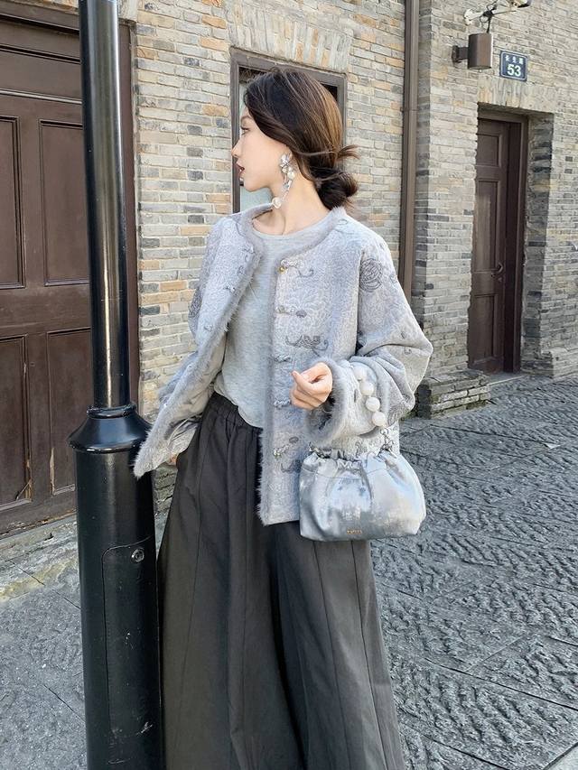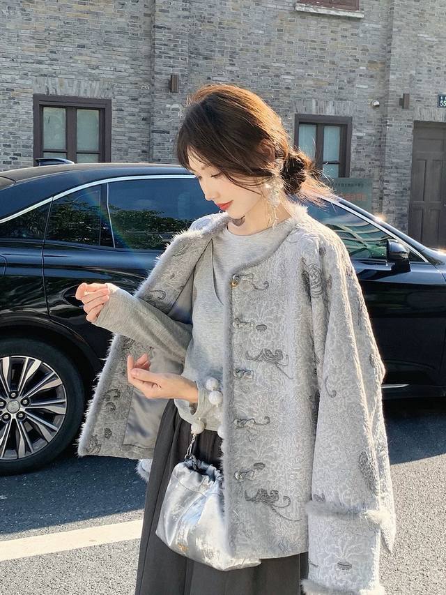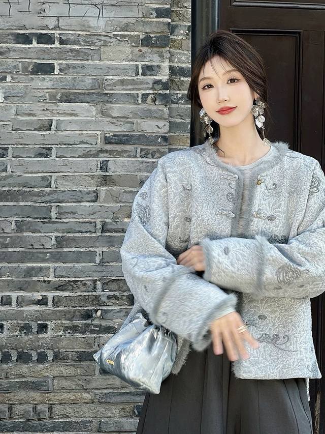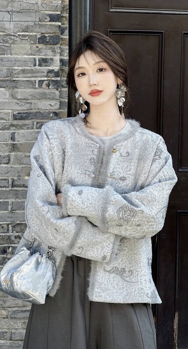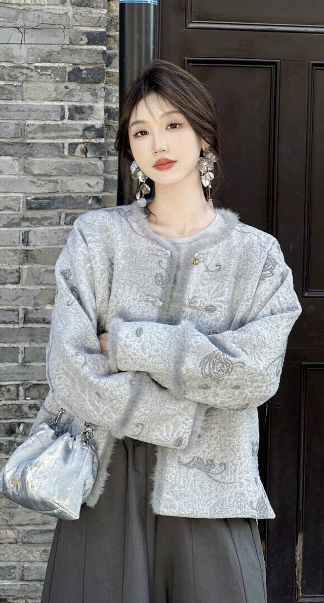 Elegant Chinese-style mink fur coat, gray jacquard fabric with custom cat-eye buttons exudes sophistication. The slightly loose fit is flattering and easy to wear for all body types. Imported mink fur trim is used on the cuffs and hem. A must-have for those seeking understated luxury. Smlxl