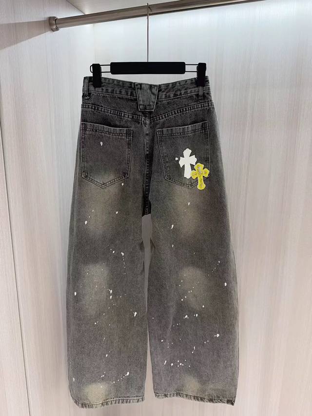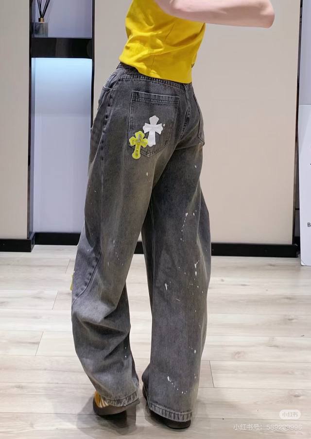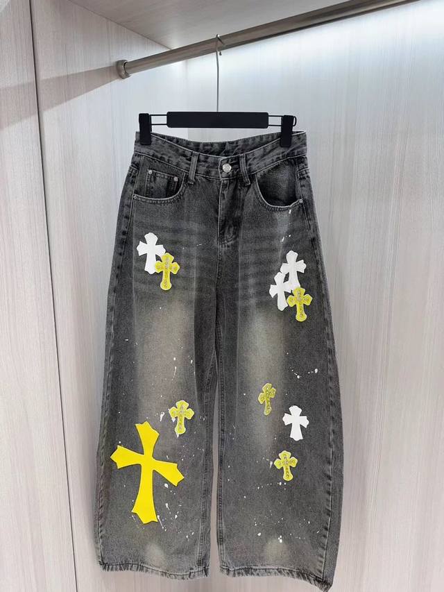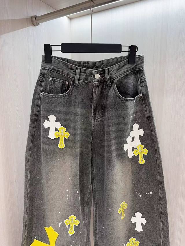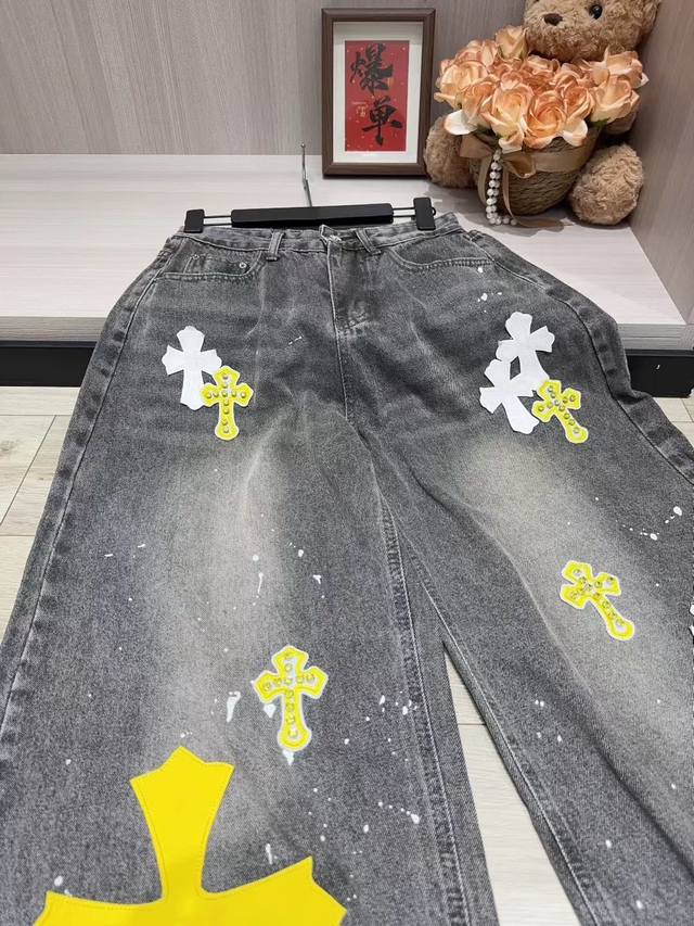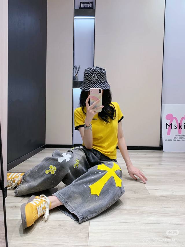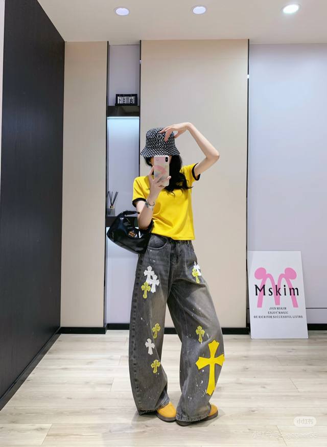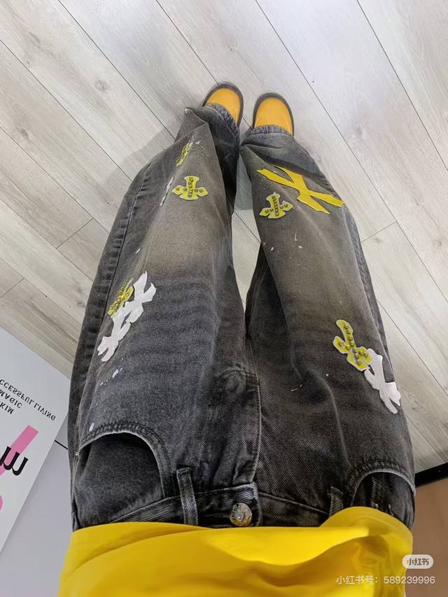 / Crowe yellow and white cross stitch leather jeans Loose version for a slim fit