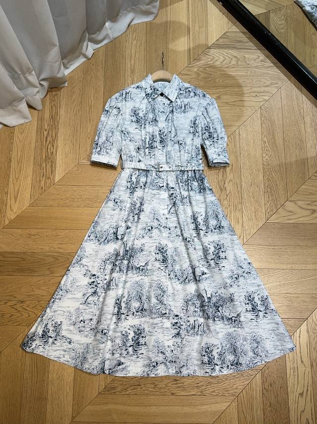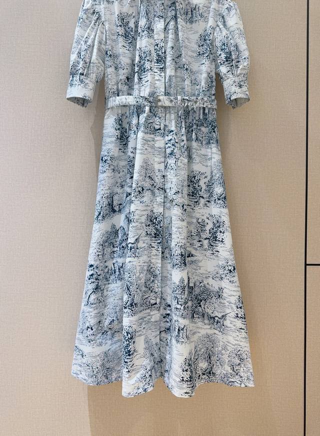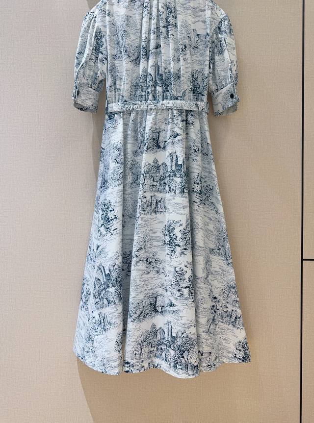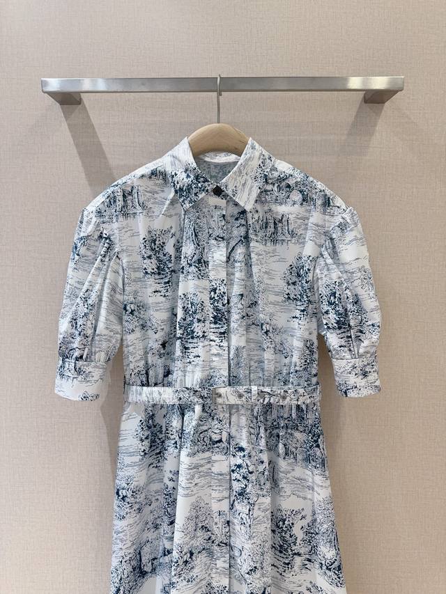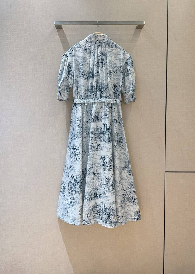 The midi dress returns in a new modern version. Made from pure cotton architectural print, it is decorated with puff sleeves and a tonal belt with metal buckle to highlight the waist. It is complemented by short sleeves, embroidered bee monogram symbol, tonal belt with metal buckle, and front button closure