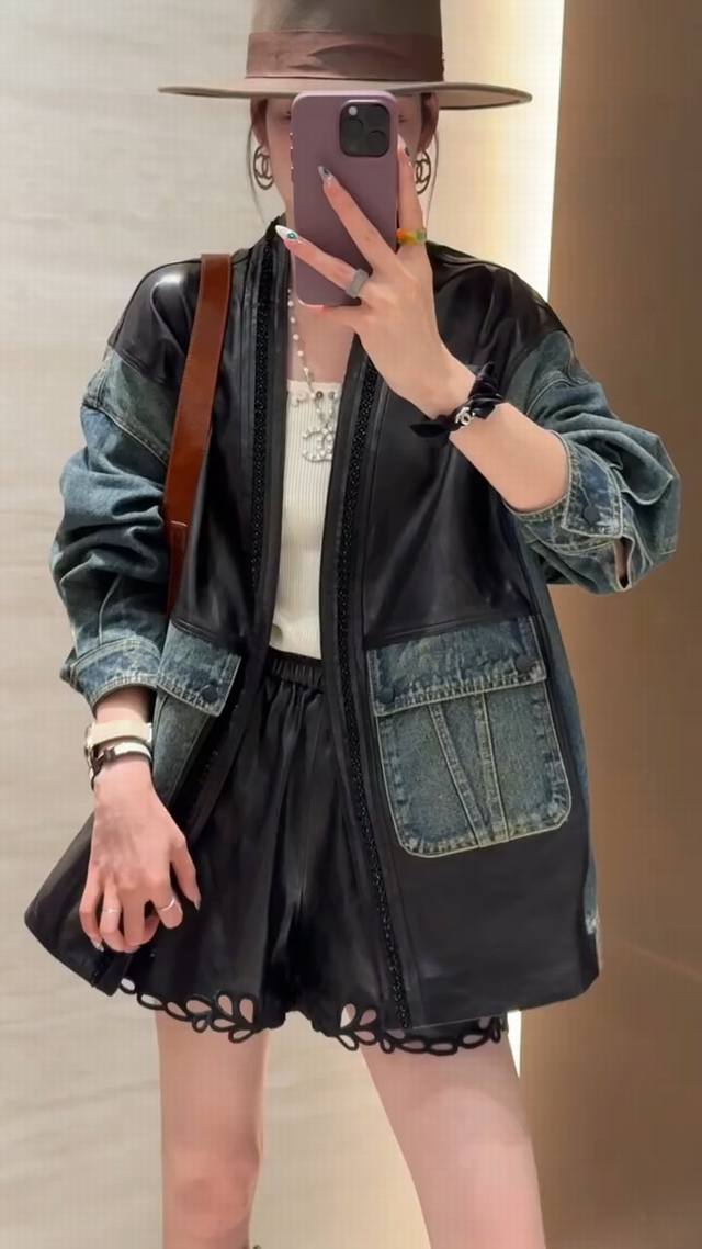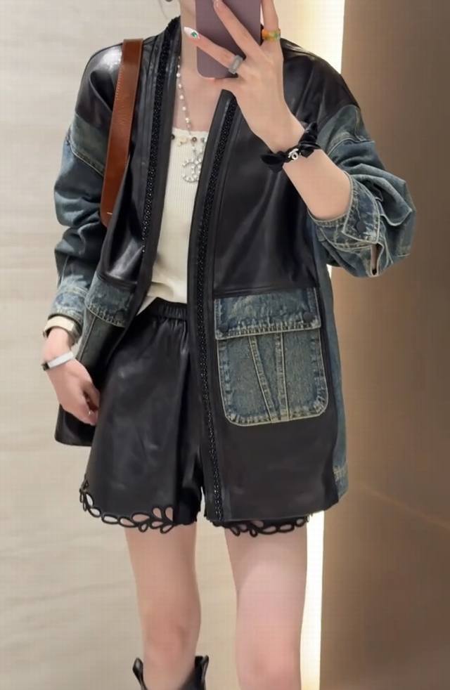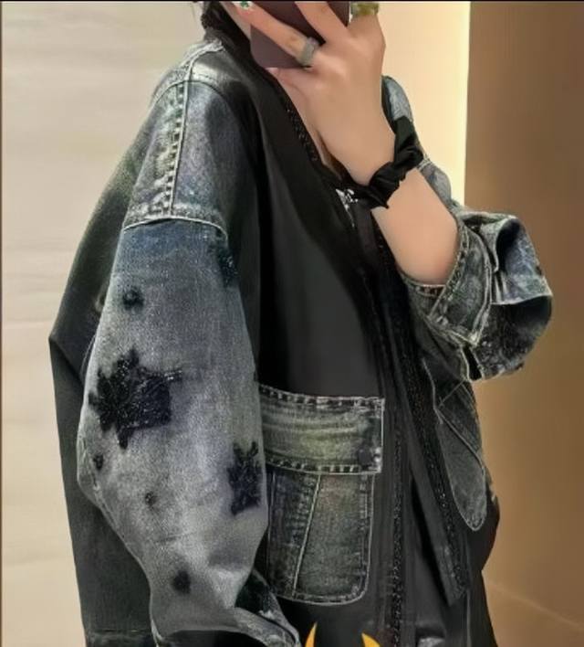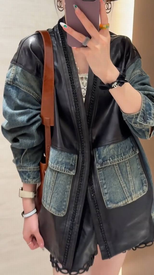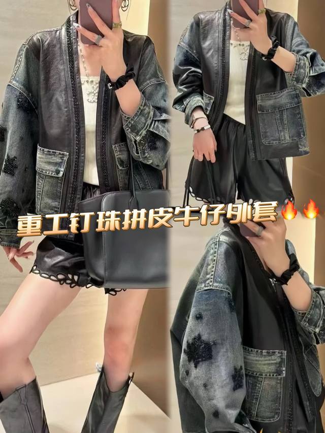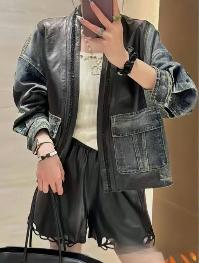 Design sense V-neck beaded stitching leather denim jacket, heavy beading is crisp without losing the sense of muscle, the overall soft and hard texture is three-dimensional and clear, the loose version is simple and atmospheric without restraint Smlxl
