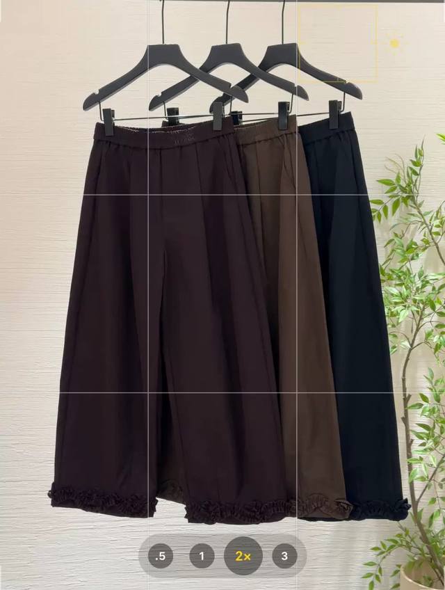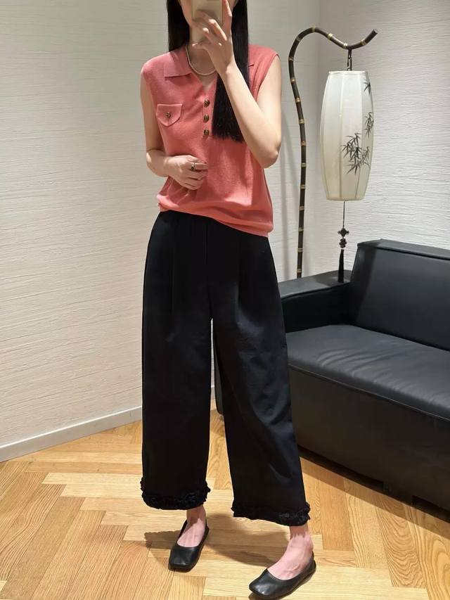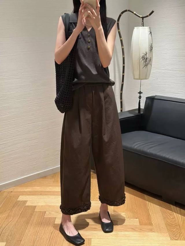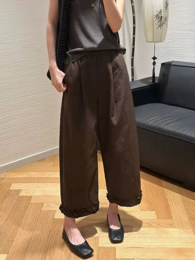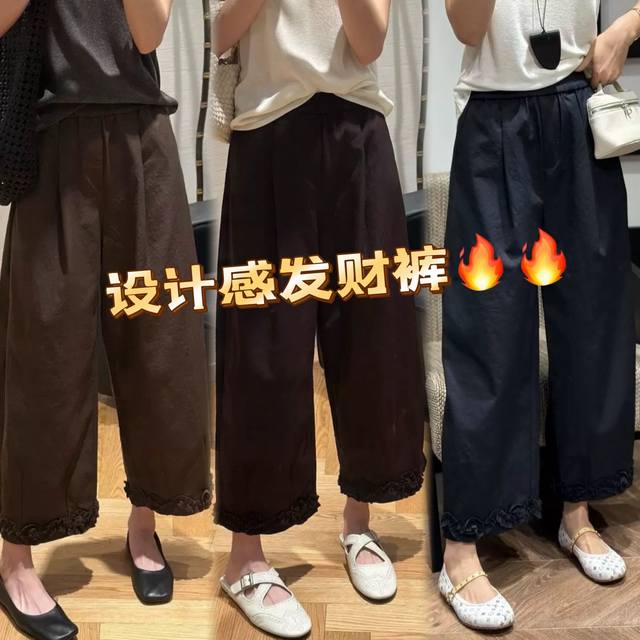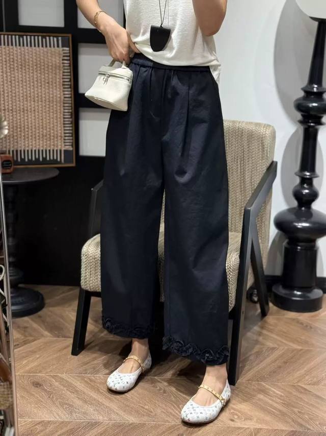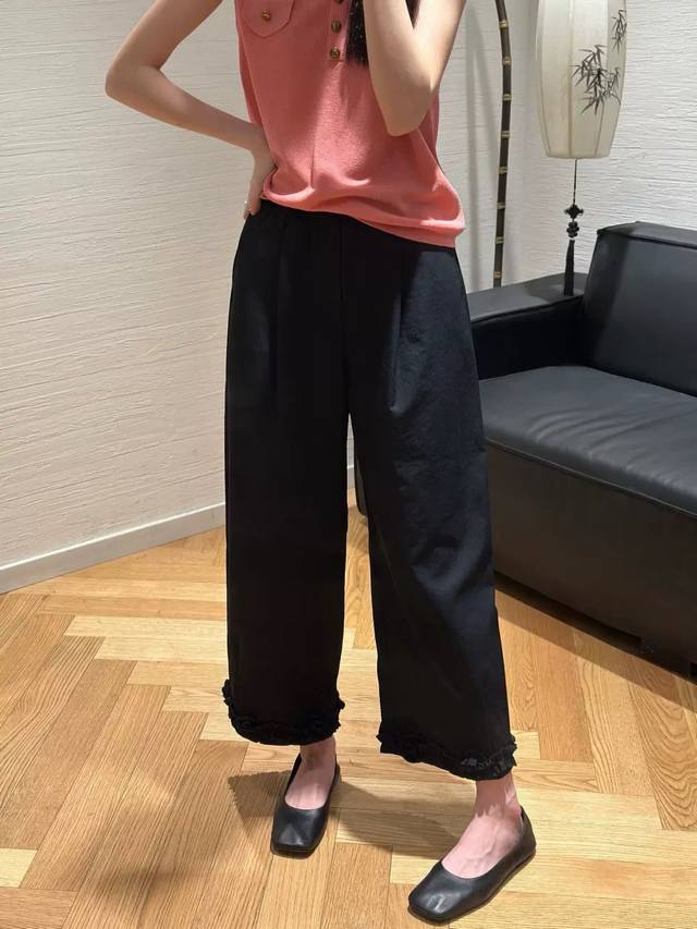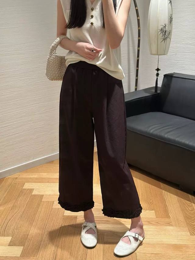 Designed straight-leg casual pants with wavy hem, loose wide-leg version, smooth lines pouring down from the waist, naturally draping and cleverly modifying the leg lines, the splicing lace at the trouser legs adds a bit of romance and softness. Three colors Smlxl