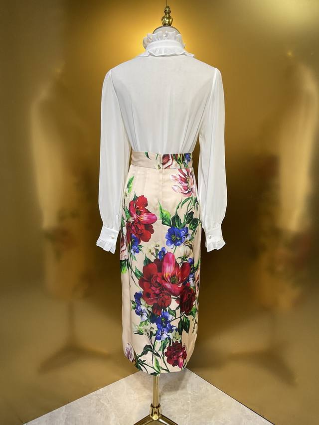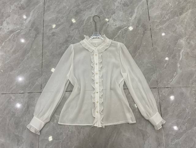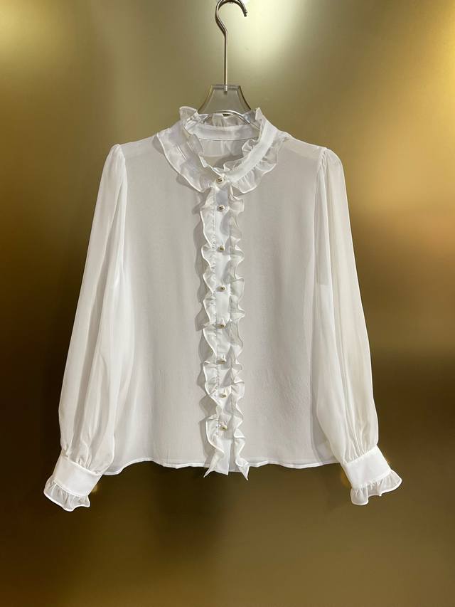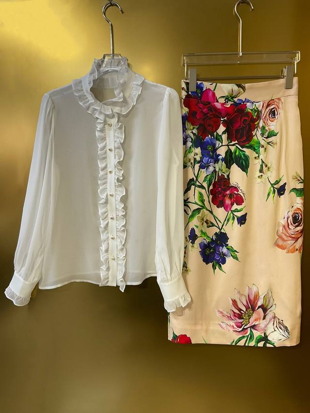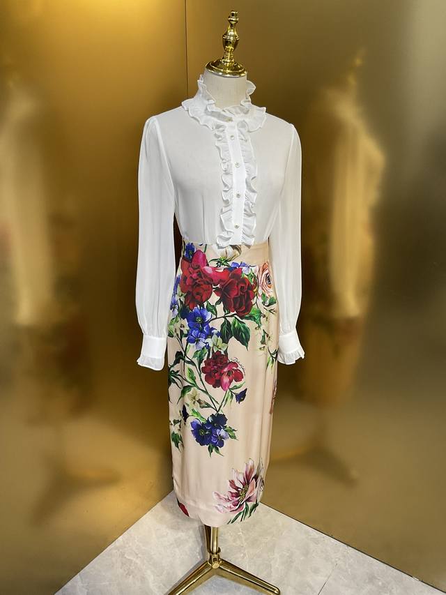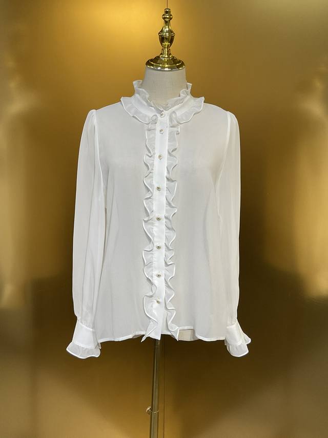 Dg new white 12 momme silk georgette custom Dg button ruffle fashion shirt silk skirt Smlxlxxl