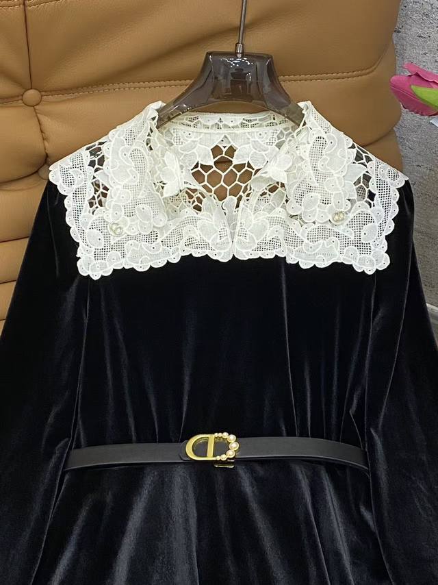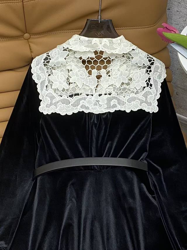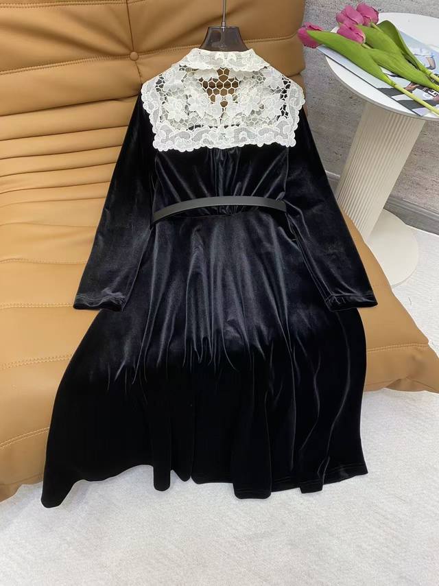 Di2026 Sp Premium Korean Velvet Dress This premium Korean velvet dress features a smooth, lustrous drape. The large lace collar adds a touch of femininity, and the matching belt cinches the waist. Perfect for everyday wear or dates, it exudes a gentle and elegant charm. Color: Black Fabric: Premium Korean Velvet Smlxl DDD