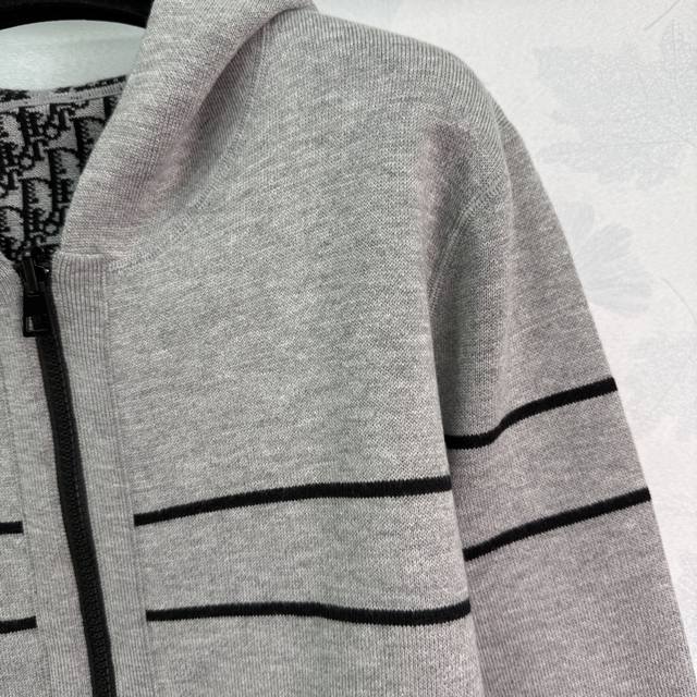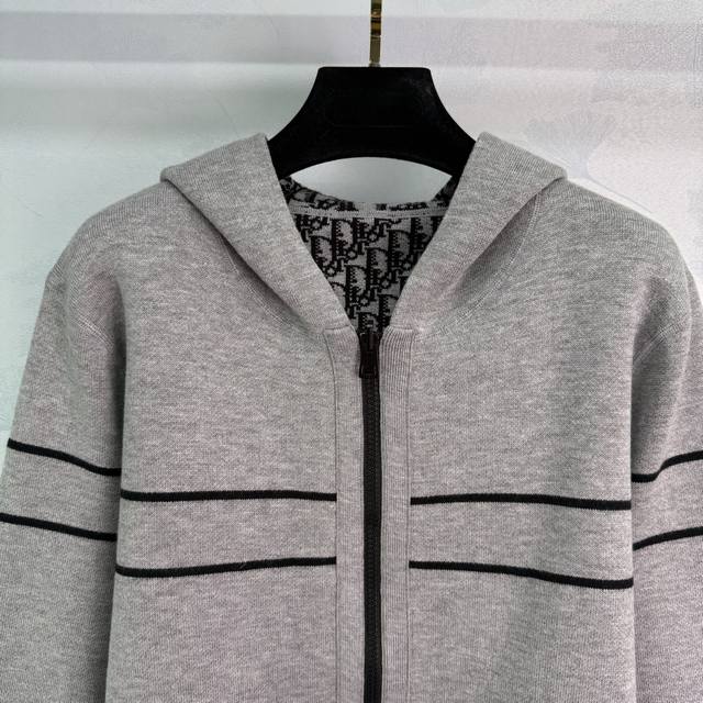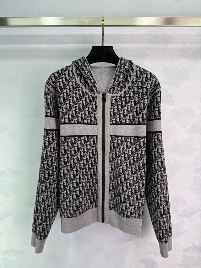 Dio* 2025 Early Fall Collection! Reversible knitted hooded cardigan! Custom-woven cashmere yarn for a comfortable, soft, and stylish look. This reversible hooded zippered jacket features a classic jacquard pattern on one side, with the brand's logo spread across the chest. A solid stripe pattern echoes the cuffs and hem, extending to the back with a lettered logo for a striking accent. The other side features a solid base, with the same horizontal stripe pattern extending to the back, creating a low-key, stylish look. One color, three sizes. Sml