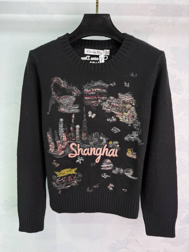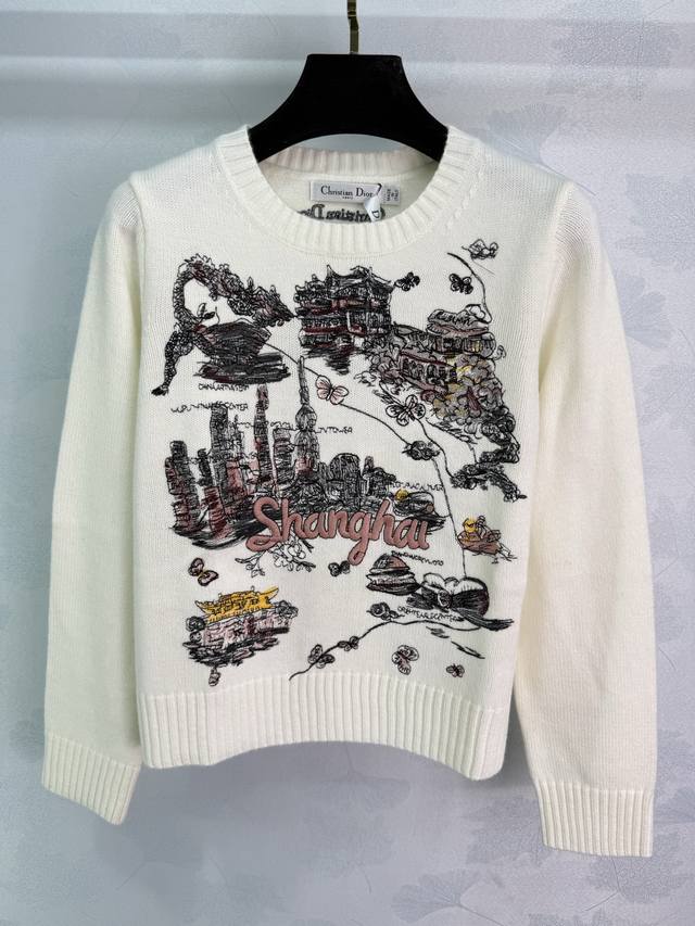 Dio* 2025 Early Fall New Cityscape Embroidered Pullover Sweater! Custom-woven from cashmere and wool yarn for a premium, comfortable, and soft feel. Round neckline, long sleeves, and a regular stretch fit. Wide, ribbed hems at the neckline and cuffs complement the hem. Embroidery on the chest depicts Shanghai's cityscape, including the Oriental Pearl Tower. Lettering accents highlight the high-end positioning and fashionable tone, creating a stylish and versatile look. Available in 2 colors and 3 sizes. Sml T226B.