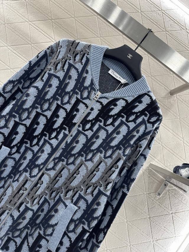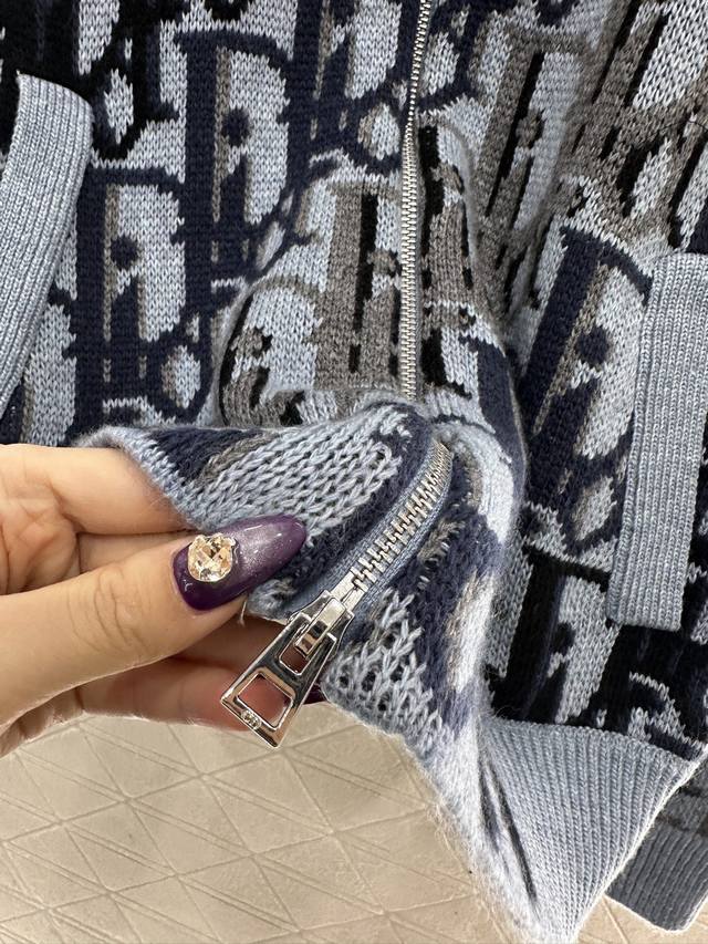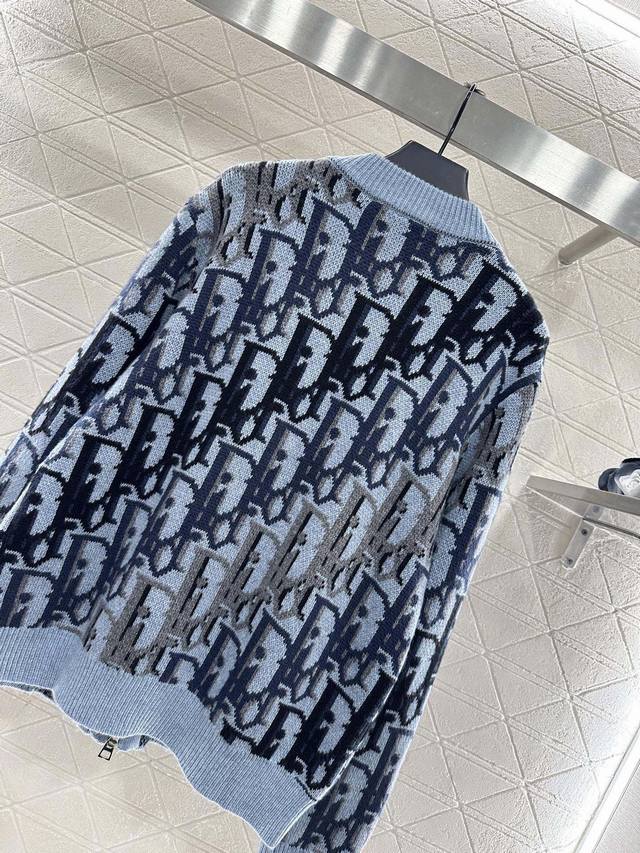 Dio* 25Ag New Arrival: Jacquard Knit Zipper Cardigan, custom-made Yb wool yarn, with a lustrous texture, soft and skin-friendly. The zipper cardigan features a textured, plain knit design that is slimming yet stylish. The neckline and cuffs echo the hem with solid-color ribbed trim, creating a fitted silhouette. The main body is decorated with a crochet pattern using color arrangements to form letter patterns, giving it a vintage feel and showcasing the brand's fashionable style. A versatile color for autumn, relaxed and effortless, perfect for layering in autumn and winter. Custom-made fabrics and accessories, high-quality version, in stock. Color: Blue. Sizes: S, M, L.