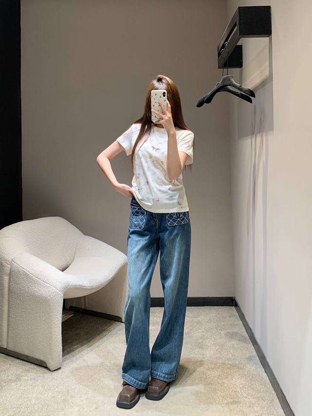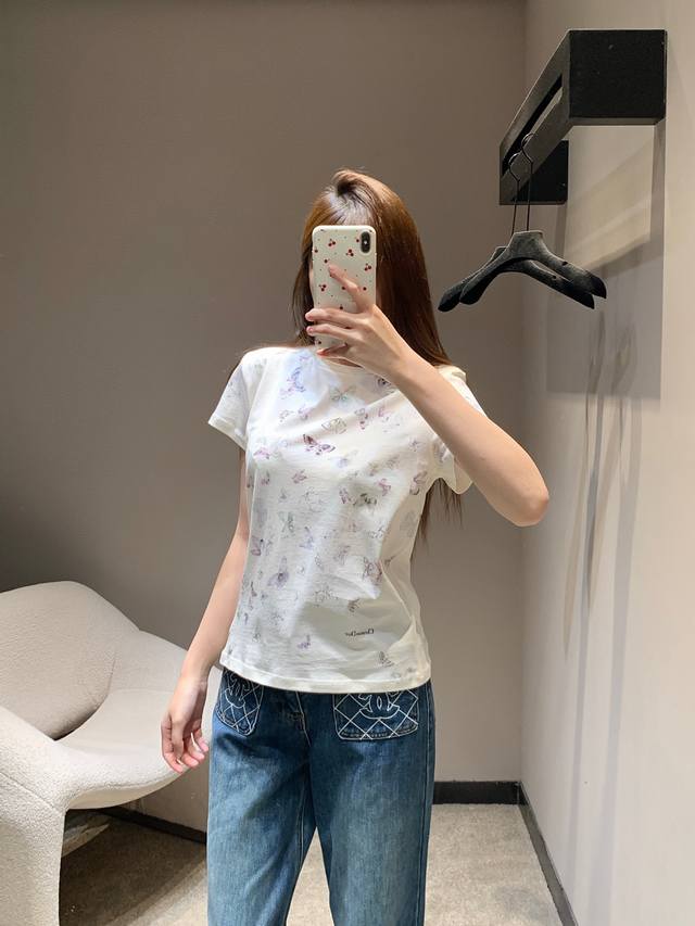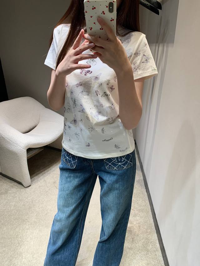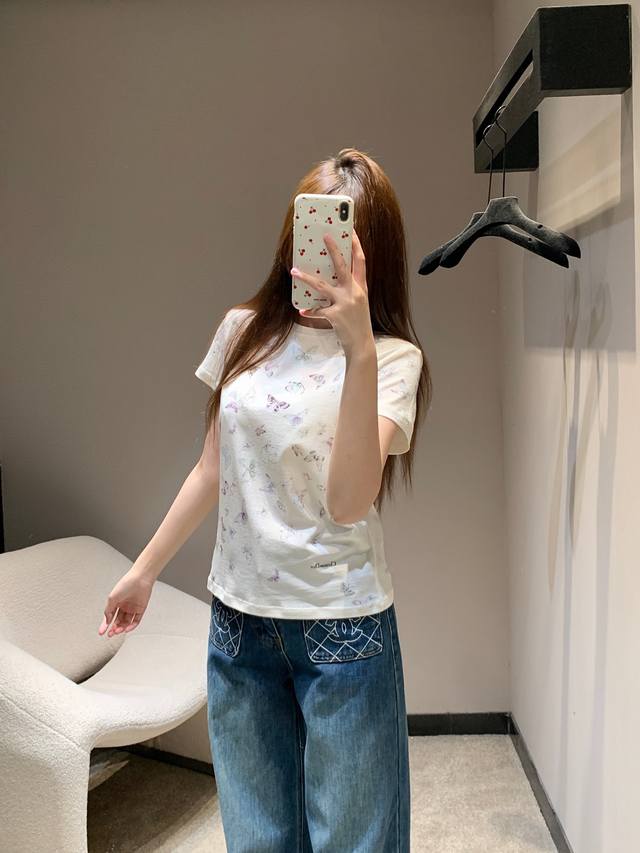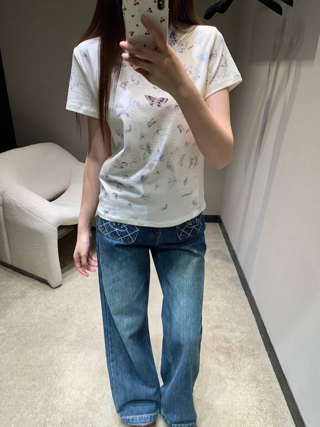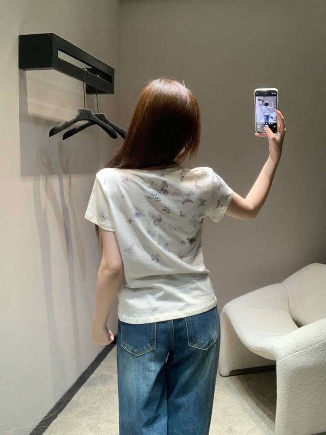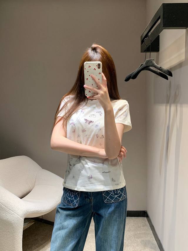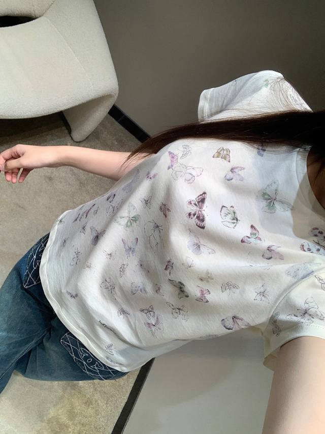 Dio* 26Ss Early Spring New Butterfly Print Crew Neck Short Sleeve T-Shirt | Exclusive Yb Development! High-Quality Production! Soft and thin pure cotton fabric with a breathable feel, slightly loose crew neck + short cut, close to the skin and not sweaty, refreshing to wear alone in early spring, light and airy to layer in early summer. Watercolor-style butterflies cover the body, light purple and light green color scheme is gentle and not gaudy, the hem is subtly embroidered with the brand logo, sweet but not cloying, instantly exuding a sophisticated lady vibe; In stock, SML DDD