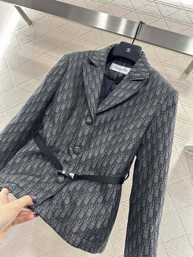 Dio* New Arrival: Lapel Jacquard Suit Jacket, Custom Yb Jacquard Cotton, Textured and Lustrous, High-End and Stylish. Features a lapel suit cut, single-breasted black and gold letter buttons, simple yet sophisticated. The entire jacket is covered in the iconic letter jacquard pattern. A snap-button belt at the waist accentuates the figure and adds a design highlight. It's high-end and stylish, concealing the hips and thighs, slimming and flattering, enhancing body forgivingness, and adding a touch of noble elegance. Suitable for commuting and important occasions, showcasing luxurious taste. Custom fabrics and accessories, high-quality version, in stock. Color: Black. Sizes: S, M, L.
