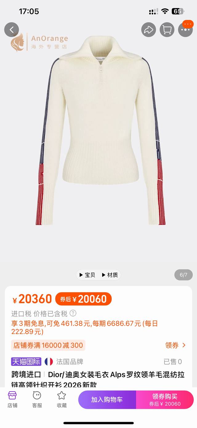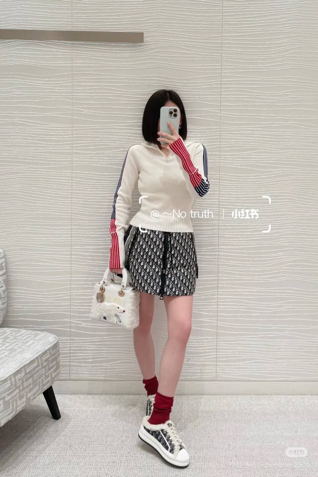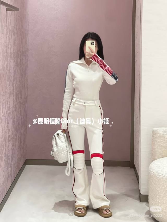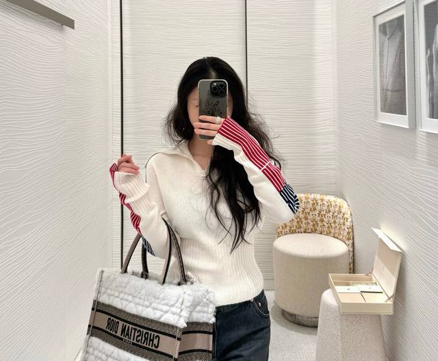 Dio* New High-End Custom 100% Cashmere Yarn Fabric, D Brand Skiwear Striped Color-Blocked Sleeves Zippered Large Lapel Slim Fit Pullover Long-Sleeved Knit Top! Off-White, Sizes 36, 38, 40. Size 38: Bust 88cm, Raglan Sleeve 76cm, Length 57cm.