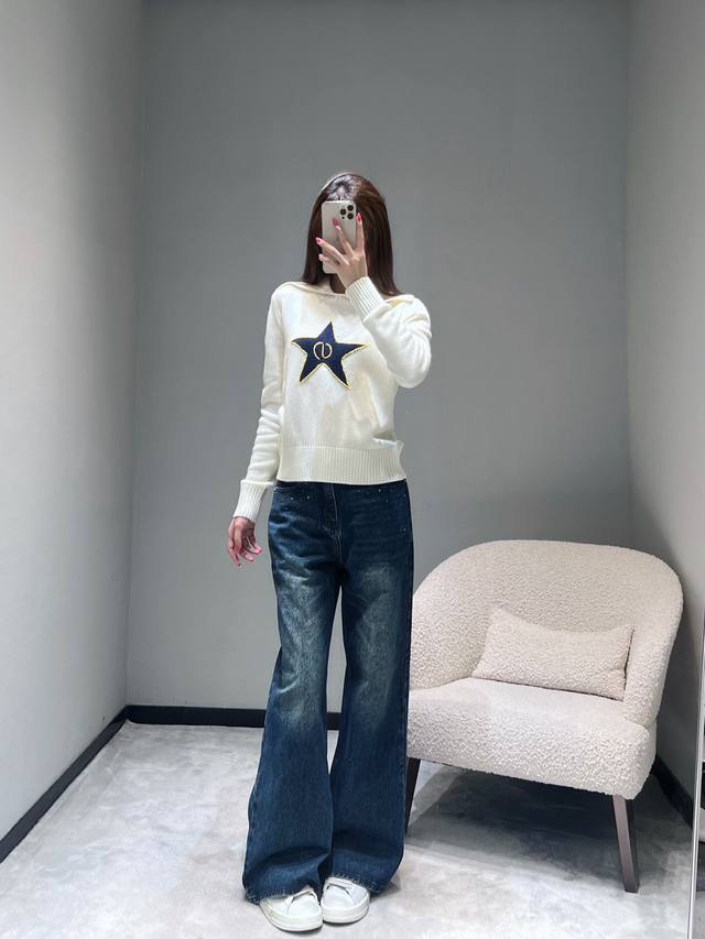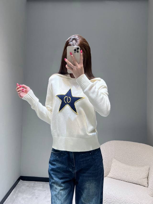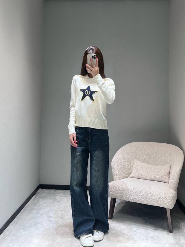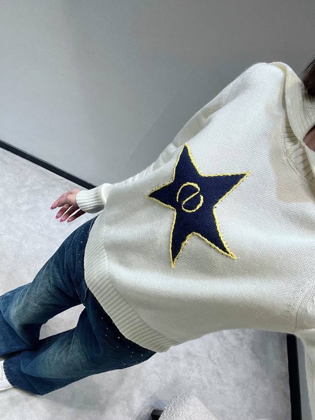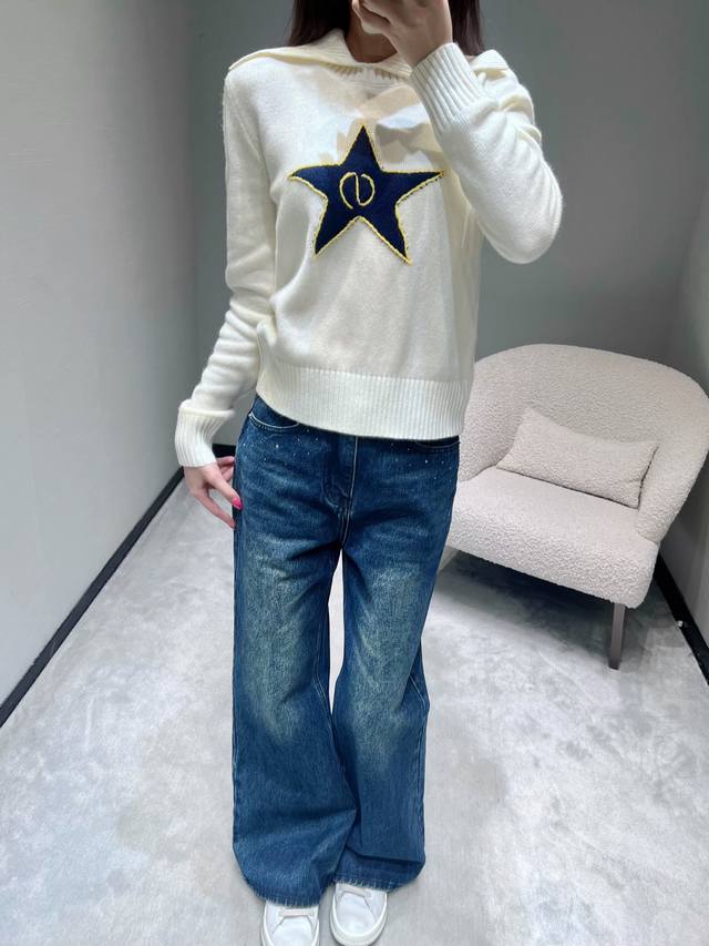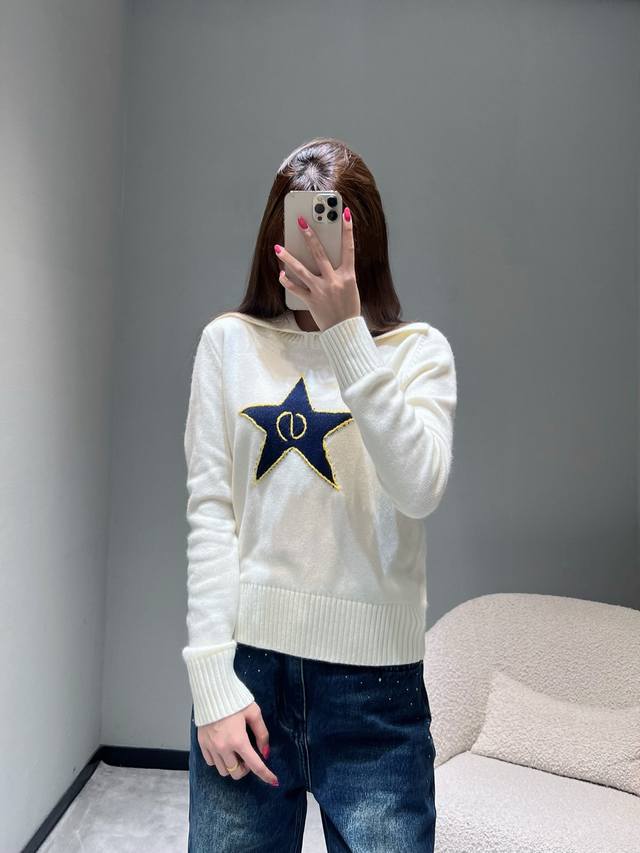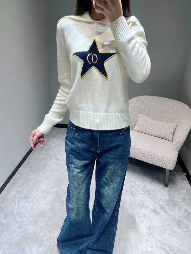 Dio* R 2025Fw High-End Custom Wool Star Knit Sweater. Made with imported yarn, this wool blend sweater features a unique large lapel design, clean lines, and a retro feel. The ribbed texture details on the collar and cuffs, along with the eye-catching five-pointed star embroidery, are particularly striking. The gold trim and the logo inside the star complement each other perfectly, showcasing meticulous attention to detail. (Sml