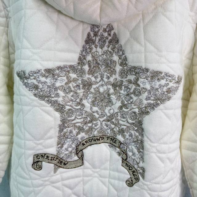 Dio* This star-embroidered quilted hoodie is made of soft knit fabric with a diamond pattern design, offering warmth and comfort. The star embroidery on the back adds a touch of detail and elevates its style. The hooded design is casual and versatile, and the loose fit is forgiving and suitable for all body types. Perfect for spring and autumn, it looks great worn alone or layered, easily creating a sophisticated look. Available in 2 colors and 3 sizes: S, M, L. T226B DDD