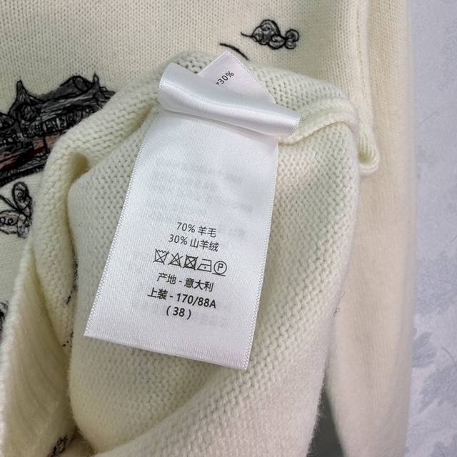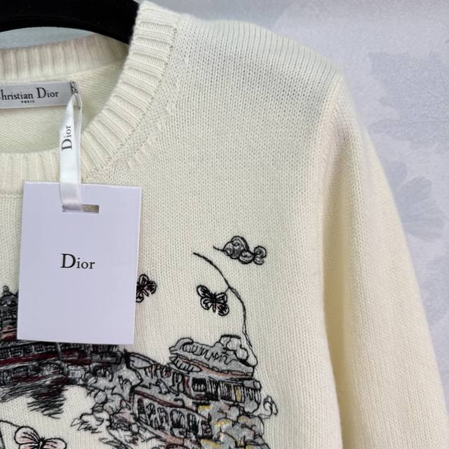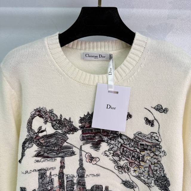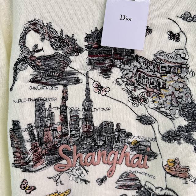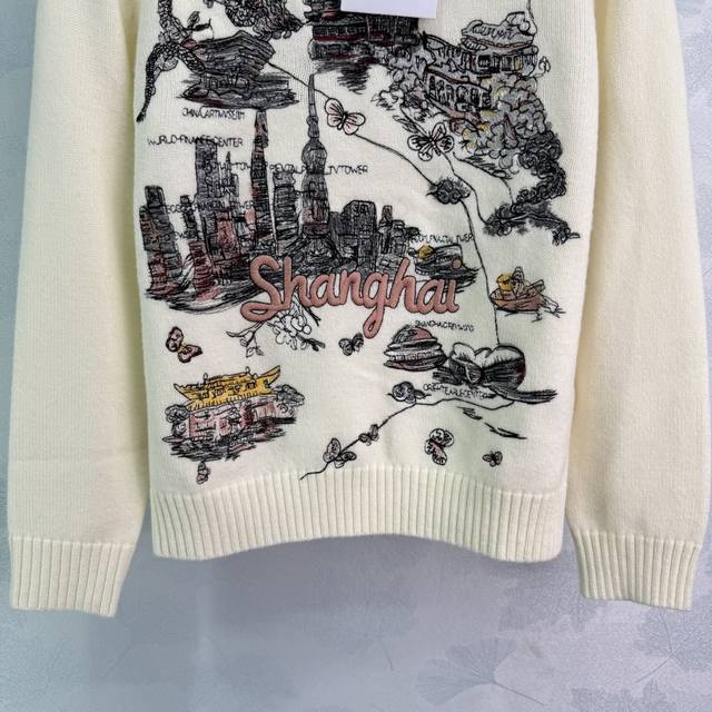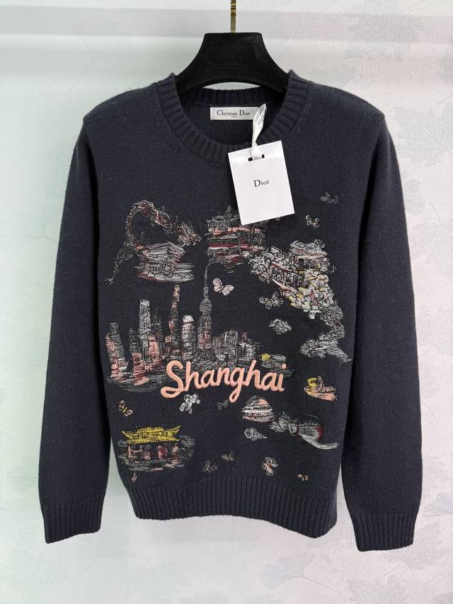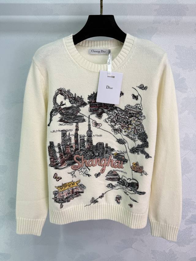 Dio*2025 Early Autumn latest series! Cityscape embroidered pullover sweater! Customized cashmere wool yarn weaving texture, high-end, comfortable and soft round neck long-sleeved sweater cut with regular elastic version, wide threaded hem at the neckline and cuffs echoing the hem, chest embroidery craftsmanship outlines the Shanghai city streetscape pattern including the Oriental Pearl Tower, with letter decoration to highlight the high-end positioning and fashion tone, creating a fashionable atmosphere and making the style more durable and versatile! 2 colors and 3 sizes Sml T226B