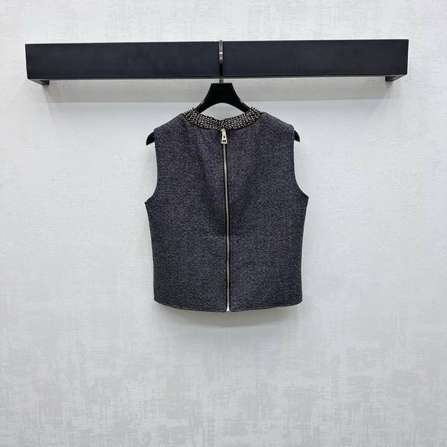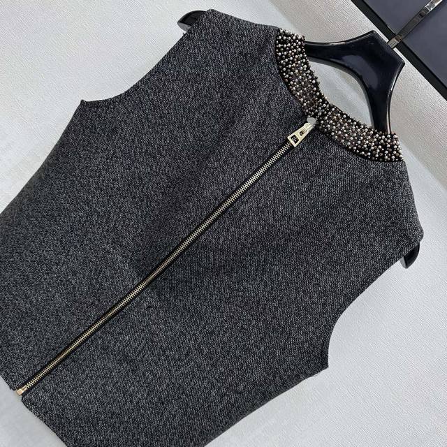 Dio*2025 New Arrival Beaded Vest and Skirt Set Customized YB Imported Imitation Wool Made with Delicate Texture and Stylish Drape. Cut and detailing enhance refinement. Back zipper slit for easy on and off, adding layered styling. Multi-row beading around the neckline echoes the lettering on the waist. Bee embroidered logo highlights the brand's softness, enhancing charm and overall intellectuality. Fabric and accessories developed. Sleeveless round neck top with straight skirt. Tailored to complete the set. Simple and sophisticated.