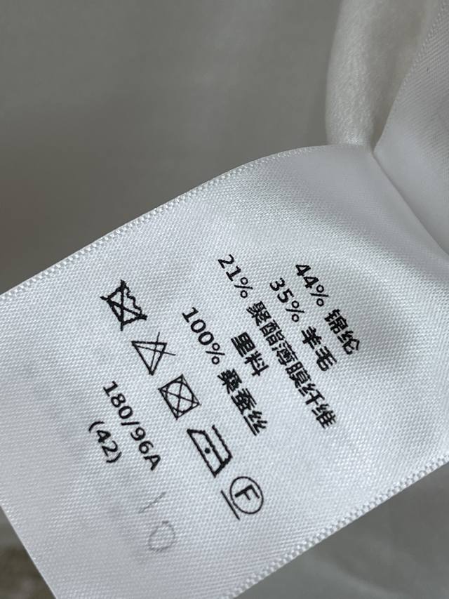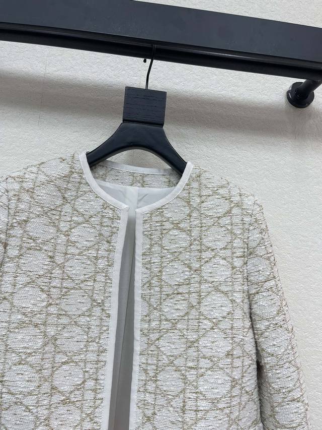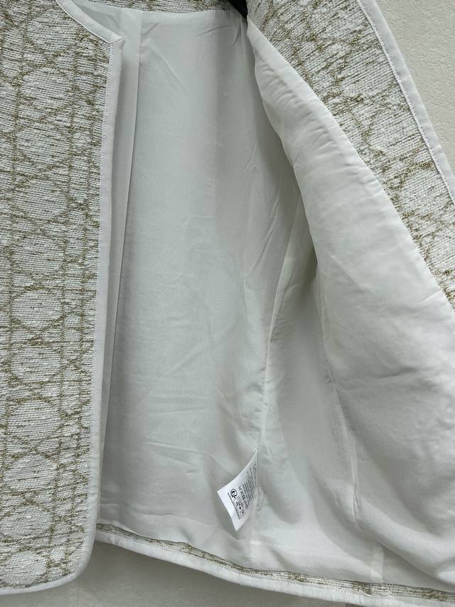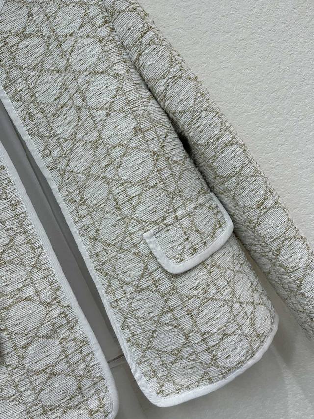 Dio*2025 New Arrival: Crew Neck Cannage Pattern Jacket, Custom Made with Imported Twill Cotton and Mulberry Silk. The entire jacket features a white base with gold thread cannage pattern elements, showcasing the brand's style. The white edging adds a touch of sophistication. The symmetrical flap pockets enhance the overall look, exuding a refined and elegant charm. The fabric and trim have been developed to create a crew neck dress jacket silhouette. The cut and cut can be paired with matching trousers or skirts for a complete set. It's sophisticated and elegant, suitable for everyday commutes or high-end parties. Intellectual and gentle. Sml Aa. DDD