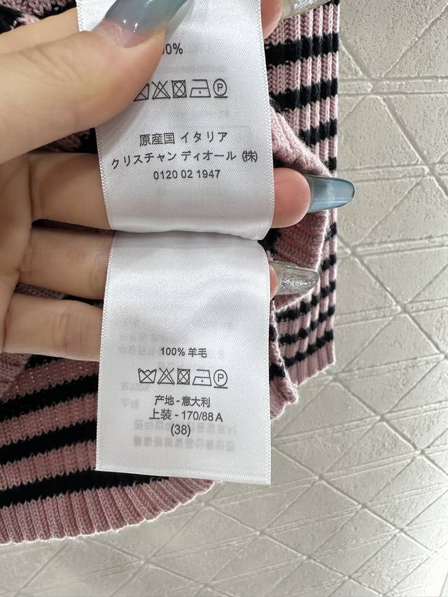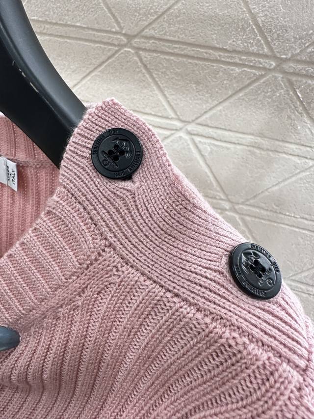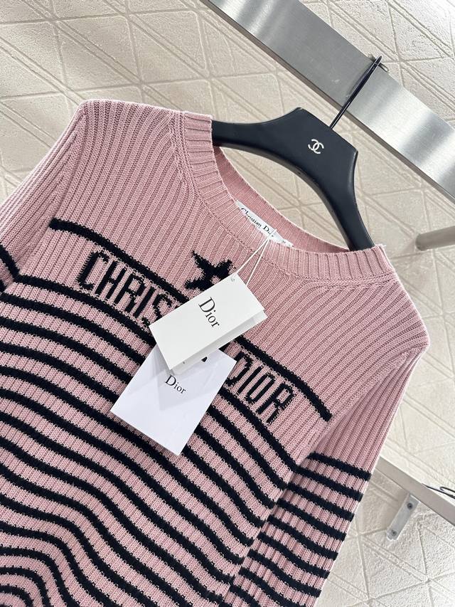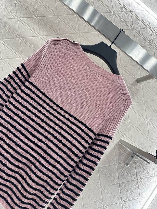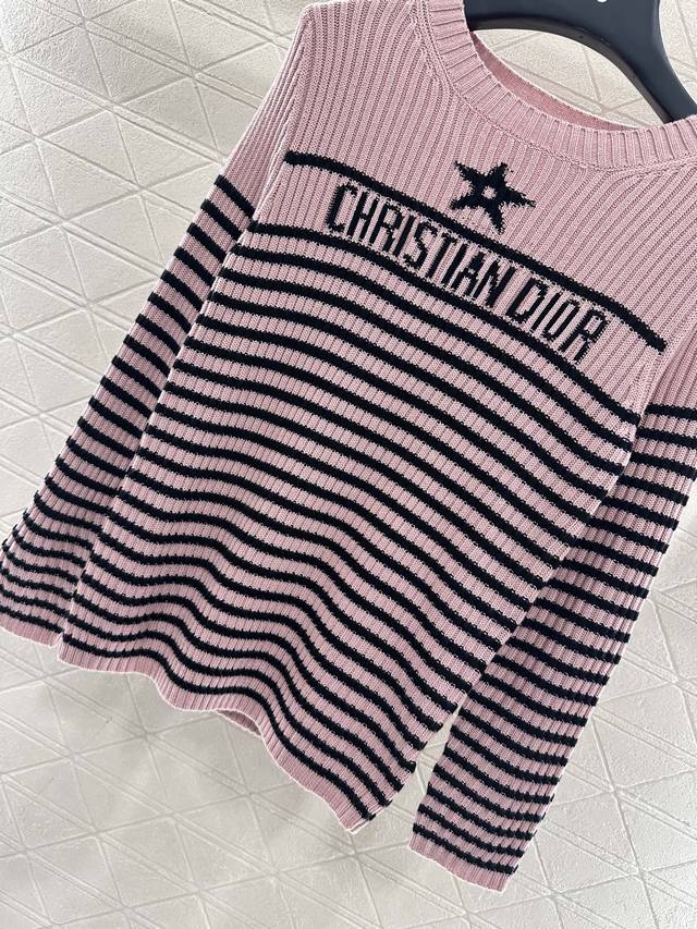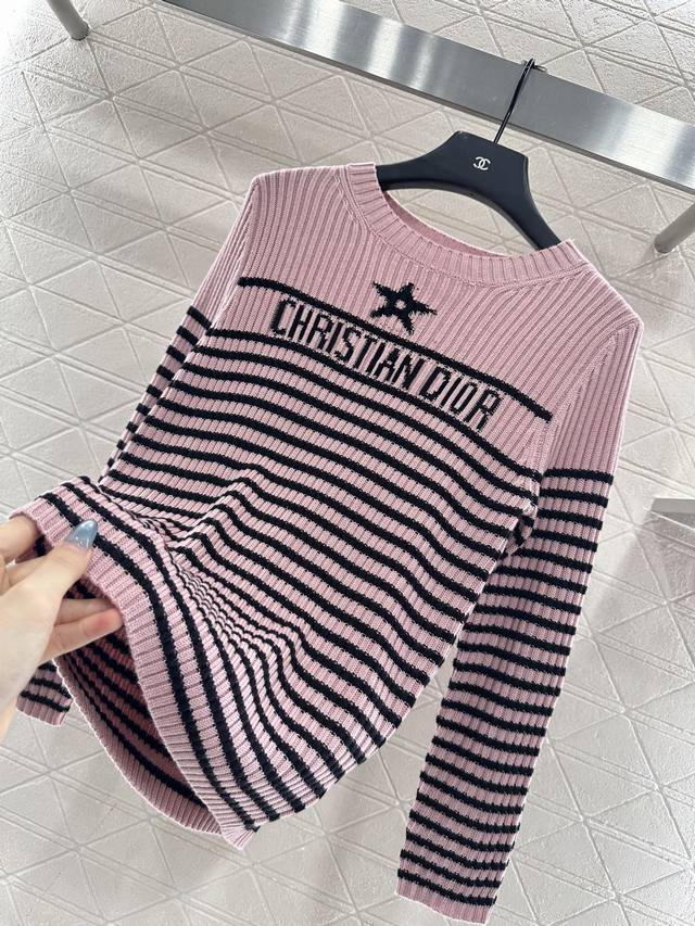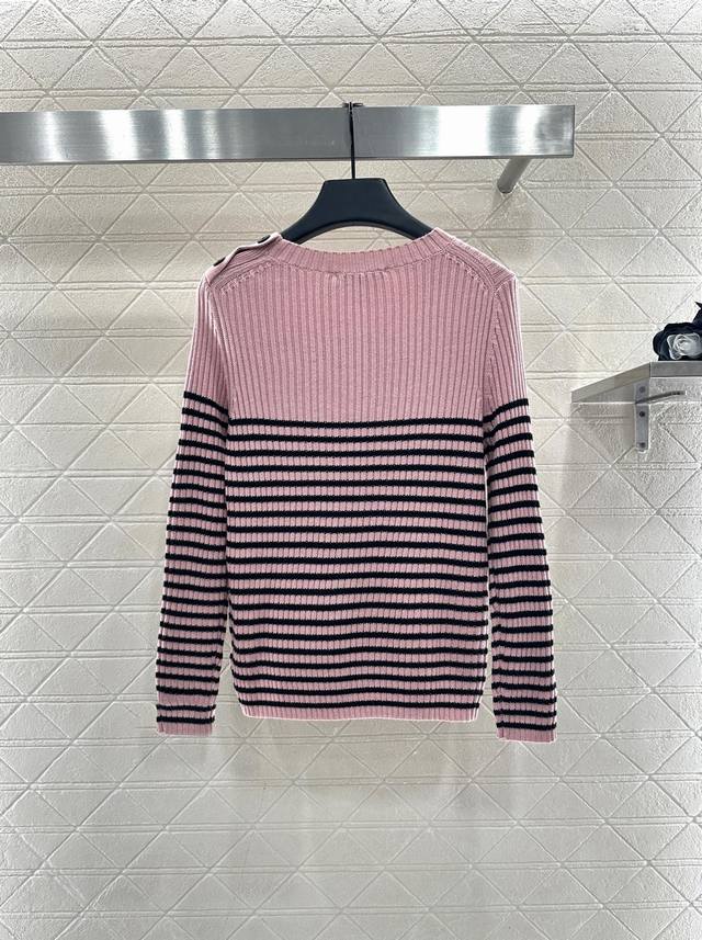 Crew Neck Striped Knit Pullover Sweater. Made with custom Yb wool yarn, this sweater boasts a high-quality feel, is incredibly soft and comfortable. The crew neck design and dense knit provide warmth and wind protection. The classic cut eliminates the need for elaborate embellishments; the logo and five-pointed star pattern on the chest effortlessly showcase the brand's style. Simple striped contrast below the chest and button details on the shoulders add a touch of artistic flair, complemented by pink and black-and-white tones, making autumn and winter outfits more gentle and elegant. The stretchy, slim fit is flattering and stylishly casual. Custom fabrics and accessories are available in three high-quality versions.