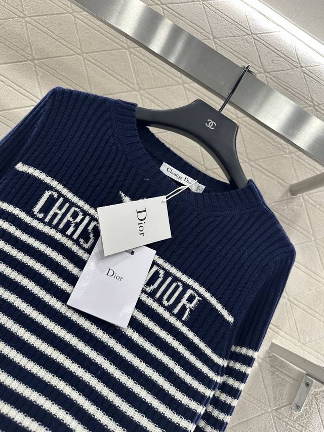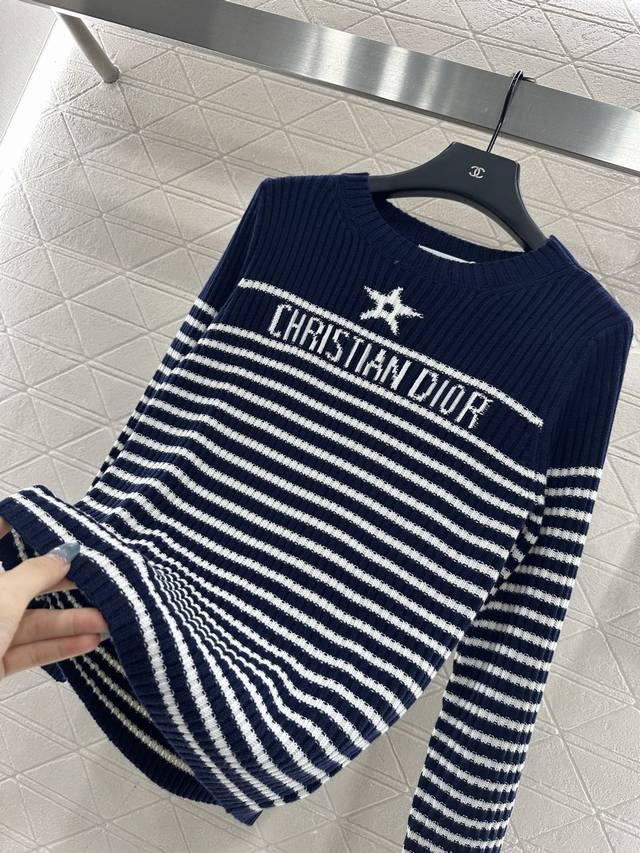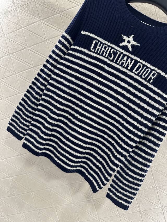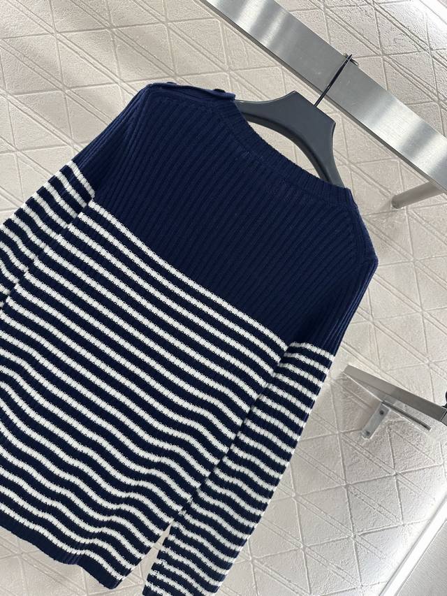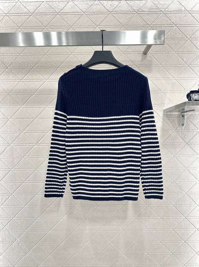 Crew Neck Striped Knit Pullover Sweater. Made with custom Yb wool yarn, this sweater boasts a high-quality feel, is incredibly soft and comfortable. The crew neck design and dense knit provide warmth and wind protection. The classic cut eliminates the need for elaborate embellishments; the logo and five-pointed star pattern on the chest effortlessly showcase the brand's style. Simple striped contrast below the chest and button details on the shoulders, combined with pink and black/white accents, create a sophisticated and elegant look for autumn and winter. The stretchy, fitted style is flattering and fashionable. Custom fabrics and accessories are available in three high-quality versions.