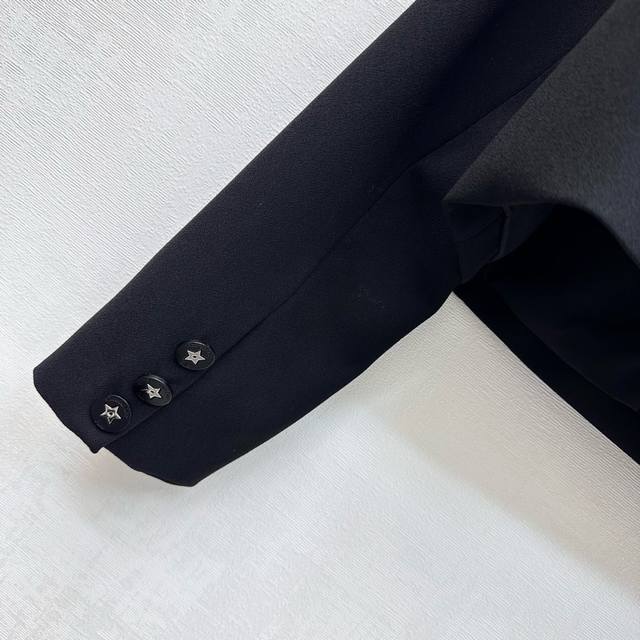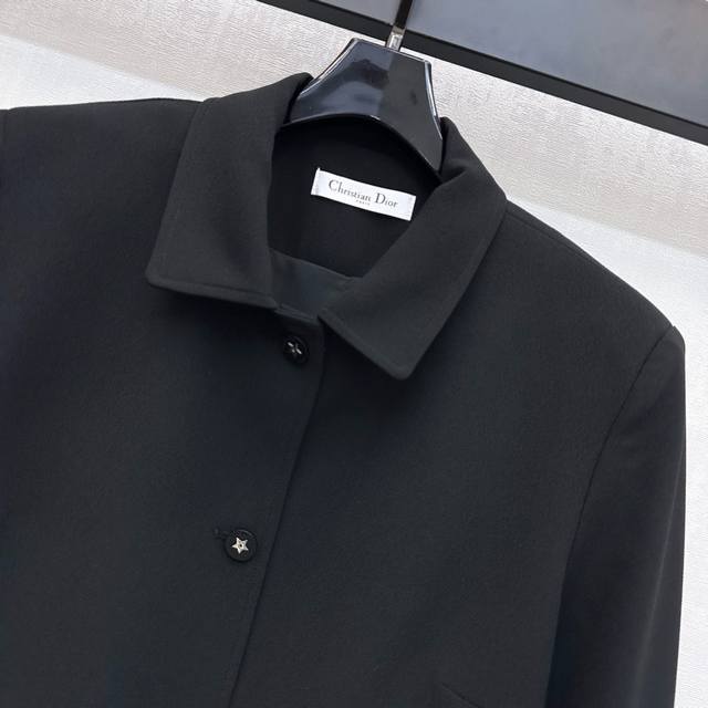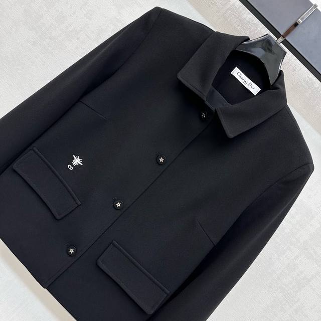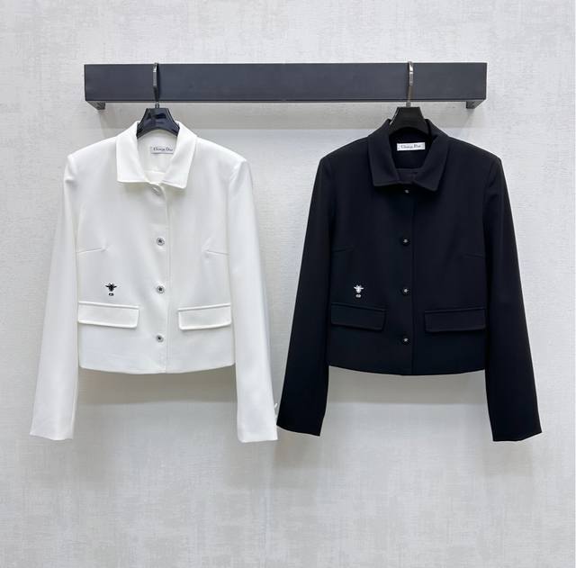 Dio*2025 New Arrival. Custom-made lapel long-sleeved jacket made of imported Yb acetate. Sleek, comfortable, and crisp. Star-emblazoned buttons on the front create a striking, stylish look. The lettering echoes the cuffs, complemented by the iconic Cd bee embroidered logo at the waist, highlighting the brand's signature aesthetic. Symmetrical faux-flap pockets add a layered look. Fabric and trim development. Straight-shoulder lapel jacket cut for a simple, sophisticated, and stylish look for everyday commuting. High-end, two-color