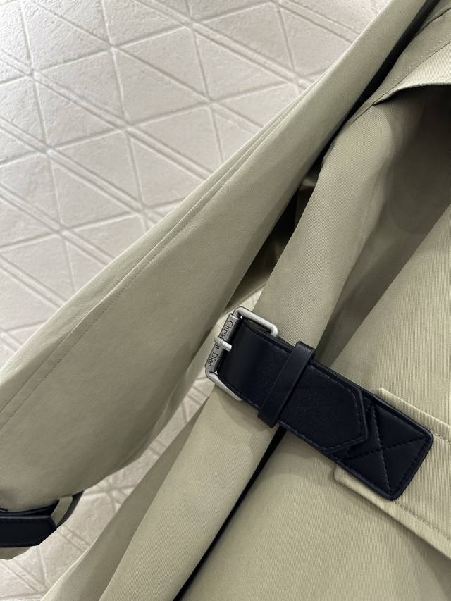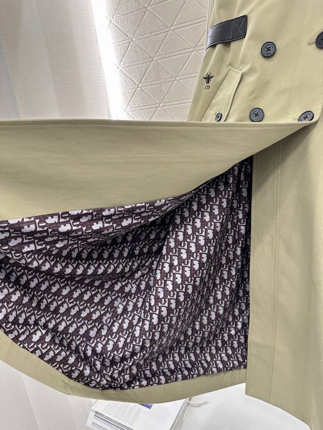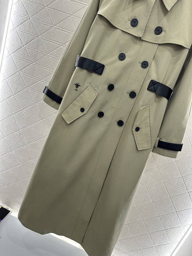 Dio*2025 New Arrival DDD Leather Buckled Long Trench Coat DDD Custom Yb imported trench coat material, crafted with superior workmanship, crisp and stylish. Long belted trench coat with a lapel, symmetrical folded cape design at the collar, double-breasted round buttons on the front, and slanted flap pockets enhance the coat's layered look. Short black leather belts on both sides accentuate the figure, echoing the shoulder and cuff buckles. Bee embroidery at the hem complements the monogram lining, subtly showcasing the brand's style when open, creating an elegant silhouette. Exudes British elegance and charm. Customized fabrics and accessories, high-quality version DDD