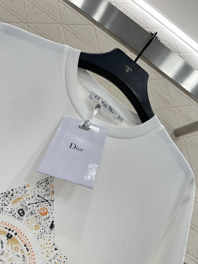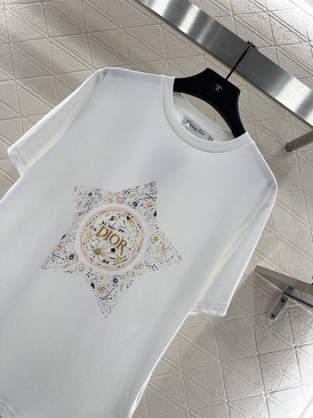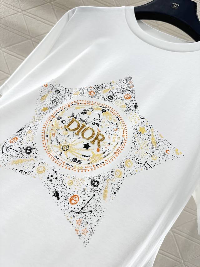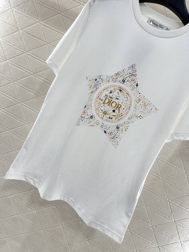 Dio*2025 New Arrival DDD Round Neck Beaded Print DDD Custom Yb 100% Cotton Material, High-Quality Texture, Soft and Comfortable, Regular Short Sleeve T-Shirt Cut, Made of 100% Cotton with Slight Stretch for a Slimming Effect. The body is decorated with cosmic elements such as stars, moon, and sun, combined into a pattern that matches the brand's style, and embellished with beaded lettering. The overall style is ethereal and harmonious, full of design sense, and looks great worn alone or as an inner layer. Custom fabrics and accessories, look for the high-quality version. DDD