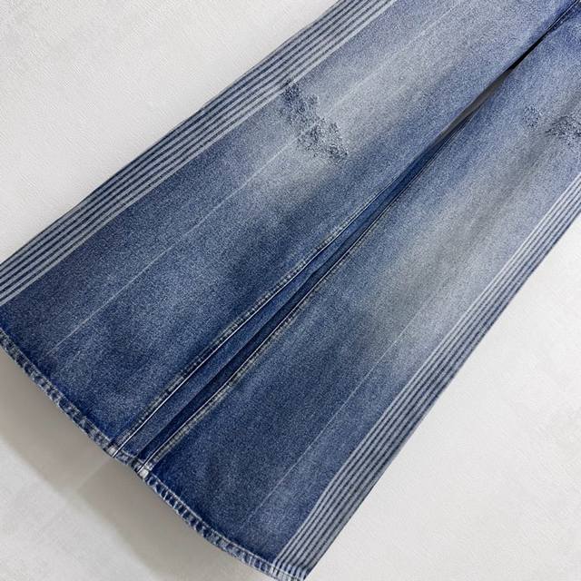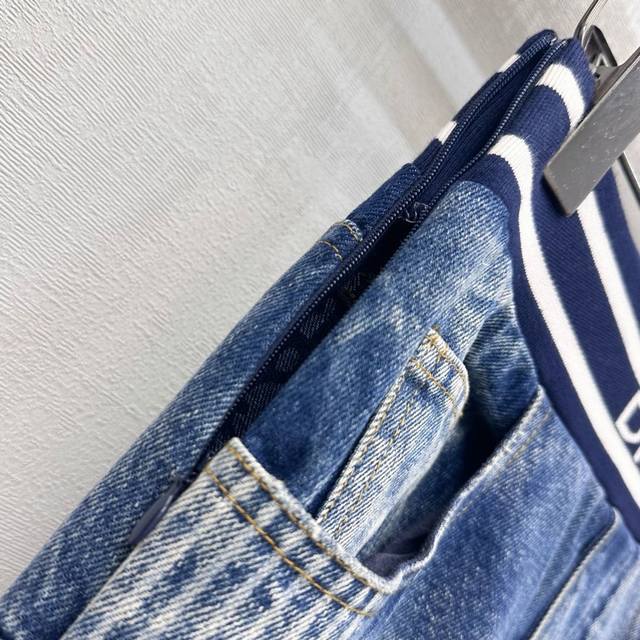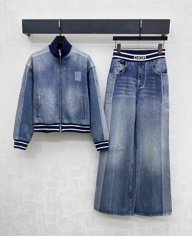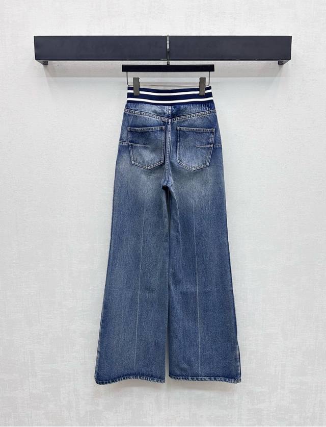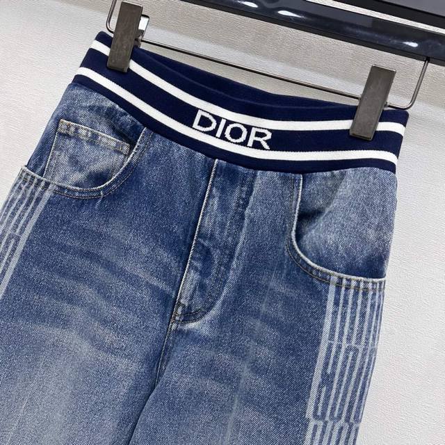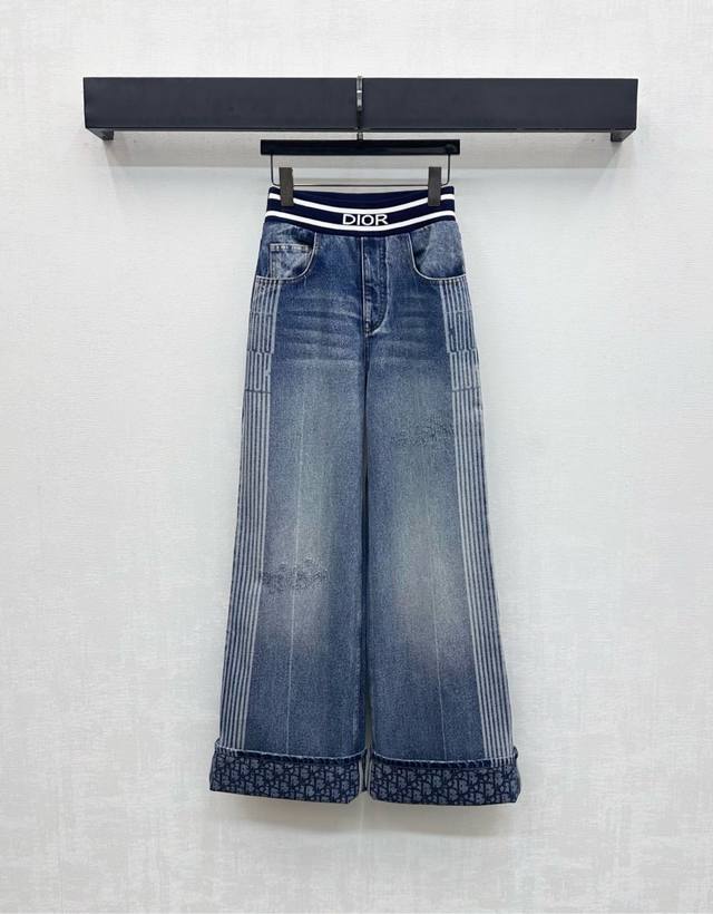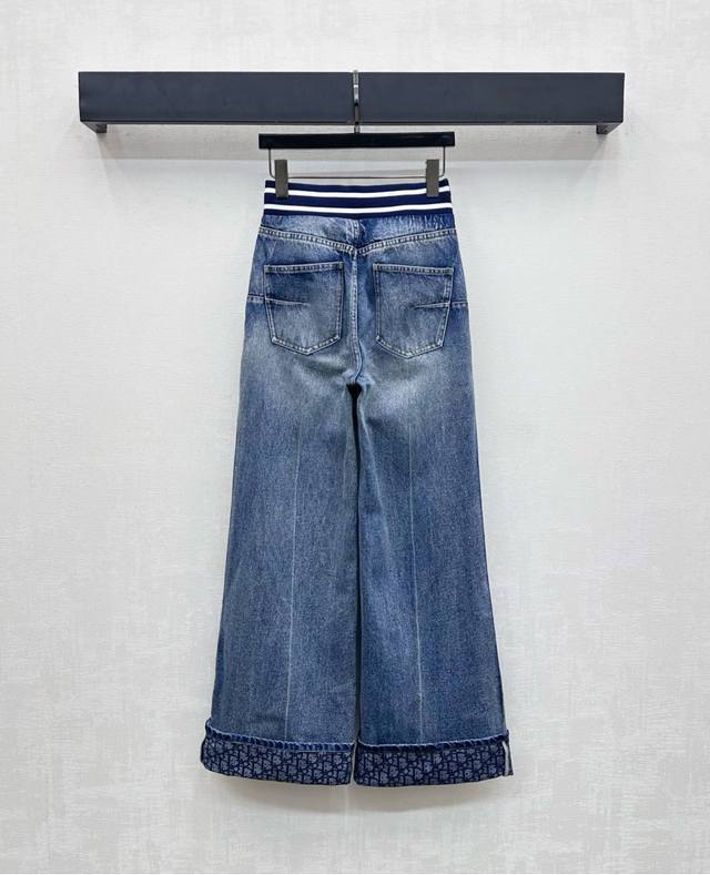 Dio*2025 New Arrival: Stretch Webbing Jeans. Custom-made YB imported twill cotton denim. Soft, comfortable, and breathable. Repeated enzyme washing creates a uniform texture. High-waisted, double-pocket design with laser-cut stripes on the outside. Letter webbing adds layered styling. Elastic webbing accents at the waist echo the letter logo, complementing the fully paved jacquard lining that highlights the brand's signature. High-waisted, elastic-waisted jeans are designed to complement the matching jacket, perfectly showcasing the brand's style . High-end, stylish outfit.