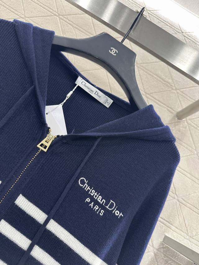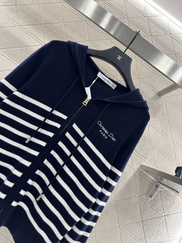 Striped Knit Hooded Jacket. Made with custom Yb wool yarn, featuring a delicate vertical ribbed knit finish. This hooded jacket has a drawstring zipper closure and is finished with elastic ribbed trim. The embroidered logo on the chest maintains a consistent design aesthetic, creating a sophisticated yet casual look. Two-tone stripes below the chest add a touch of style, and the stretch fabric offers a more forgiving fit, contributing to the brand's fashionable style. Custom fabrics and accessories are available in two high-quality versions.