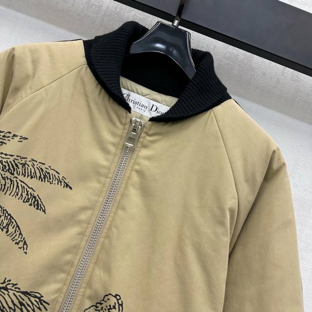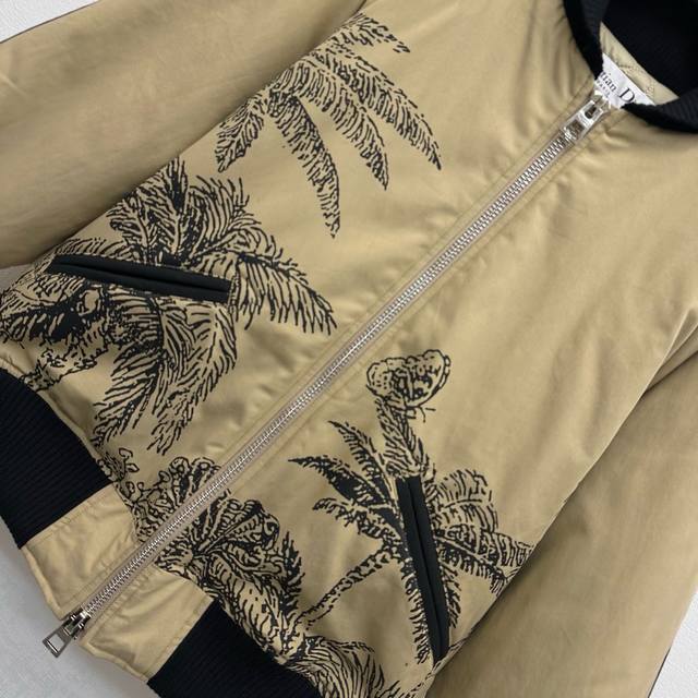 Dio*2025 New Arrivals: Custom Printed Padded Jacket. Made of imported YB twill cotton for a premium look. Lined with evenly distributed cotton for warmth. The iconic butterfly and coconut palm prints throughout the front and back highlight the brand's signature aesthetic. Black elastic thread hems and cuffs enhance the look with a neat, serene hem that echoes the pockets, adding a layered look. Fabric and accessories developed for baseball jackets. Designed for everyday wear. Retro, sophisticated, and stylish.