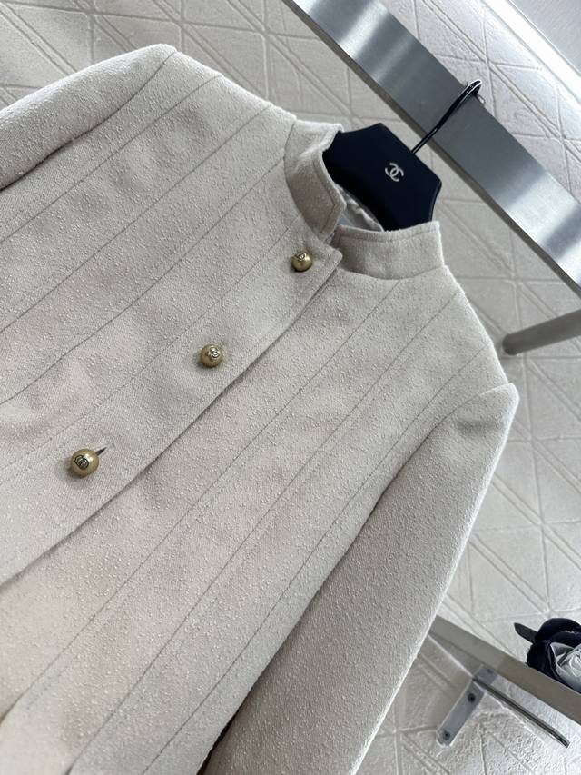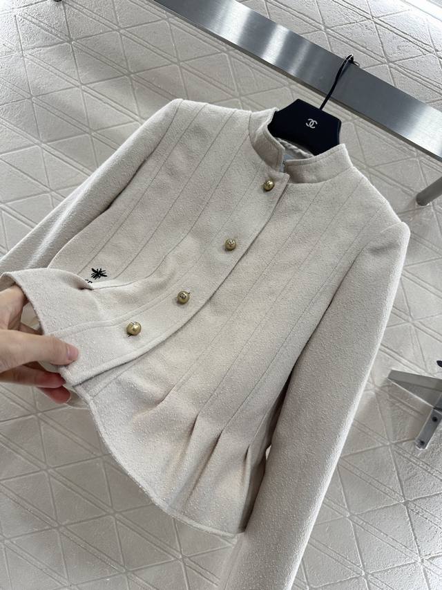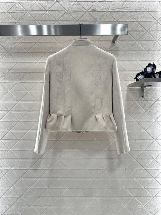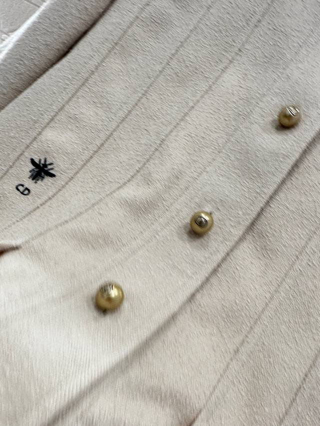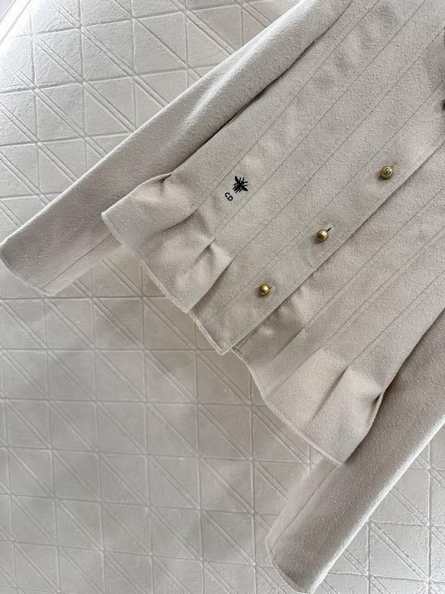Custom Yb imported cotton and wool material with a pronounced drape and smooth shoulder pads. Cut for a wide body with vertical contour lines and textured straight shoulders. Regularly cropped for a flattering fit. Exquisite flower bud detailing at the hem. Simple and elegant design. Embroidered bee CD logo at the waist. Understated luxury and elegance. Custom fabrics and accessories. Look for the high-quality version in two colors.