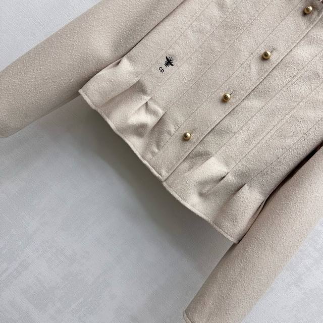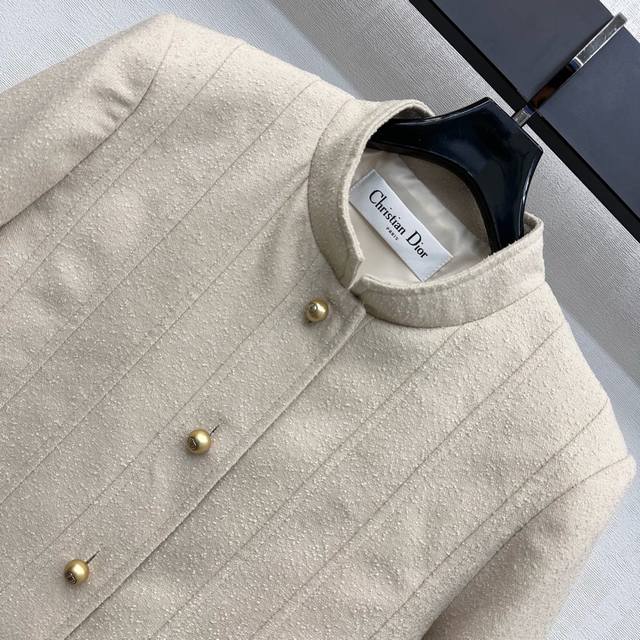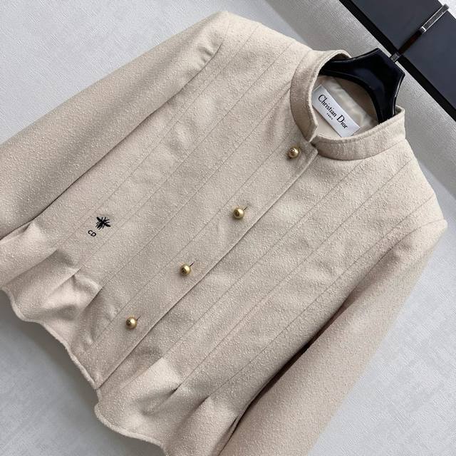 Dio*2025 New Arrivals. This stand-up collar dress jacket is custom-made from imported YB wool and rayon blend, boasting a premium look. The straight shoulder design contours to the body for a slim, upright silhouette. Three-dimensional pleats at the hem add a layered feel. The front is engraved with a Cd button for added detail, while the signature monogram embroidered logo accentuates the brand's identity. Crafted from premium materials, this long-sleeved jacket perfectly embodies an elegant, sophisticated look. It's the perfect choice for formal occasions. Available in two high-quality colors.