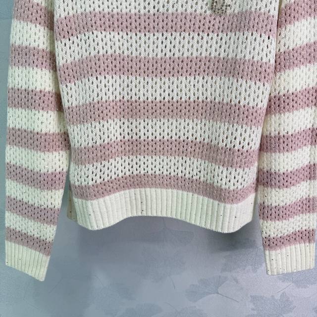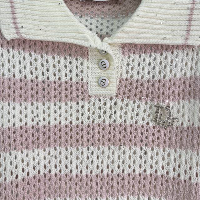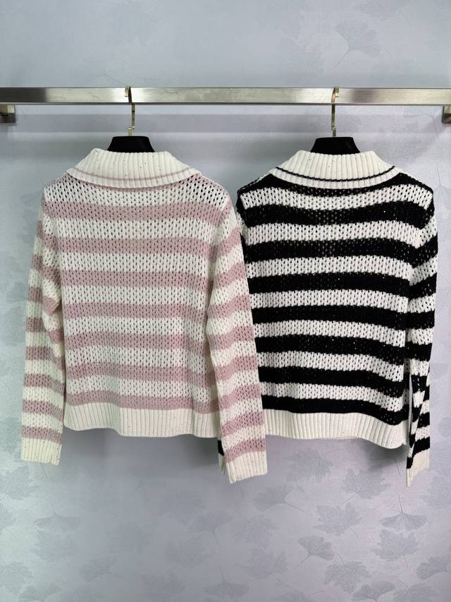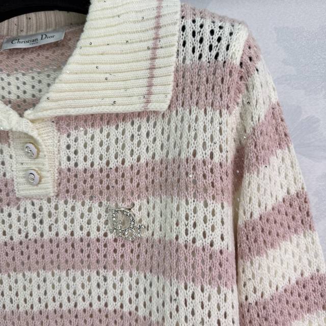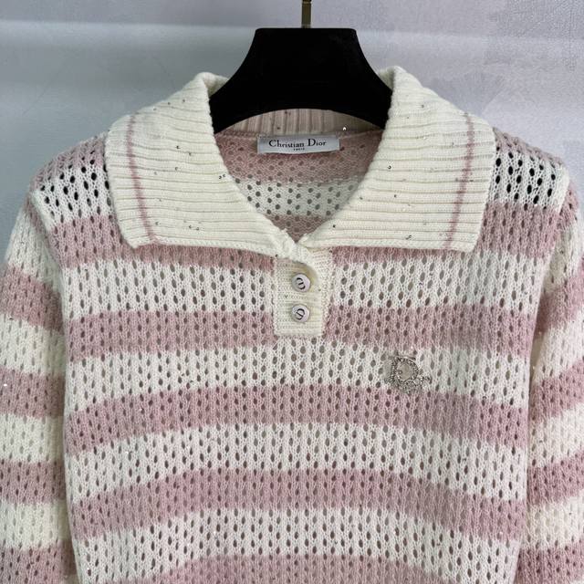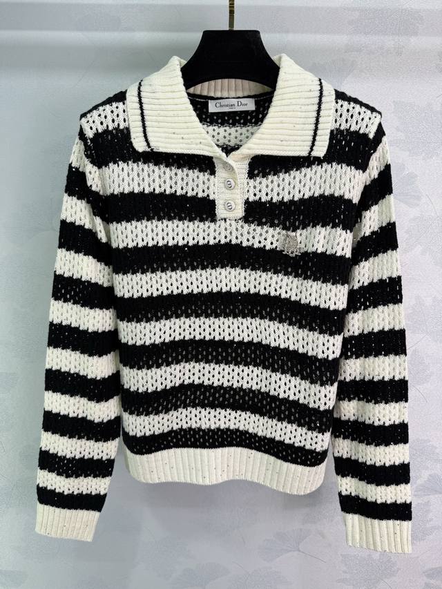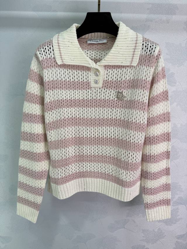 Dio*2025 new striped sweater, featuring a contrasting black, white, and pink design. The sweater features delicate openwork stripes and a polo collar with a rhinestone logo on the chest. The fabric is soft and comfortable. Available in sizes S-L and M-L, perfect for spring and autumn. T226B.