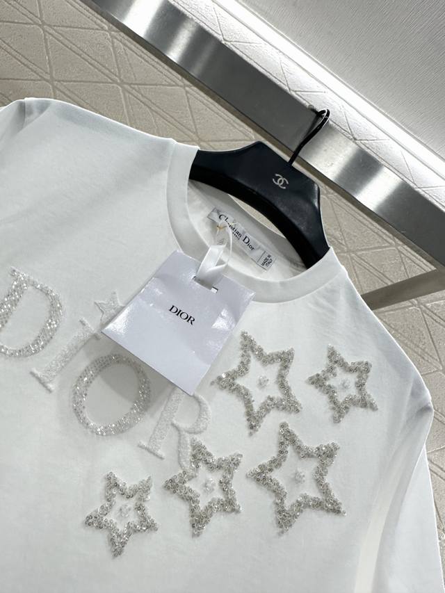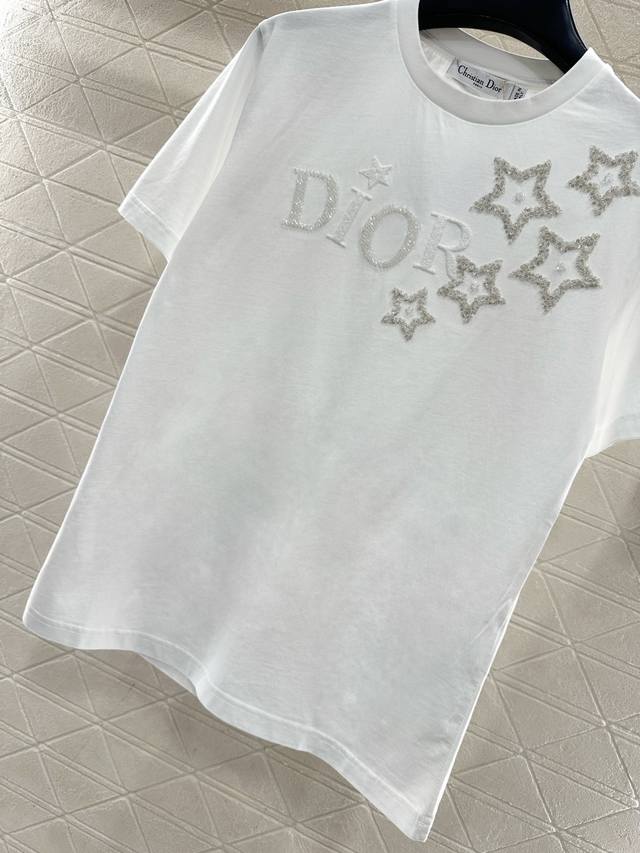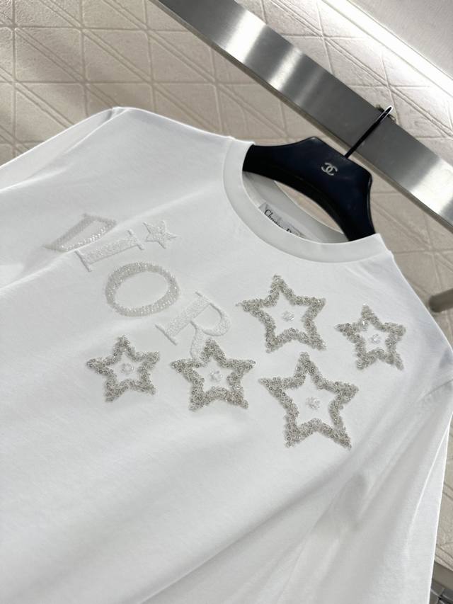 Dio*2026 New Arrival Ddd Round Neck Beaded Sequin Logo Ddd Custom Yb Mercerized Cotton, Delicate Texture, Comfortable and Breathable, Regular Short Sleeve Cut, Beaded Sequins Combined with Embroidery, Replicating the Five-Pointed Star Pattern of the Logo on the Chest, Reflecting Light for a Stylish Look. Regular Fit, Youthful and Stylish. Custom Fabrics and Accessories, High-Quality Version, Two Colors: White and Black DDD