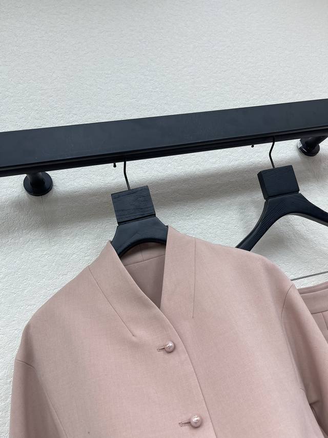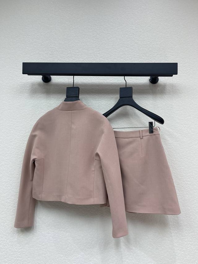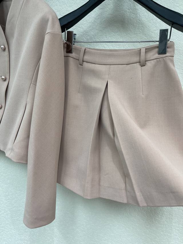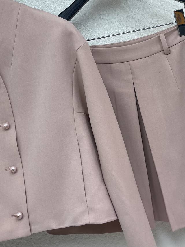 Dio*25 Autumn/Winter New Arrival: Elegant V-neck Pearl Button Jacket Set with Short Skirt. This set is so beautiful and youthful! The three-dimensional cut and H-line silhouette are universally flattering. The classic A-line skirt is slimming and elongating, a must-have for sophisticated women. The custom wool blend fabric has a superb texture. The color is a gorgeous nude pink, which is very flattering and easy to wear. Sizes: S, M, L. Jacket: Aa250, Skirt: Aa170. (DD)