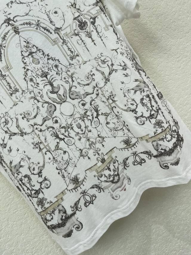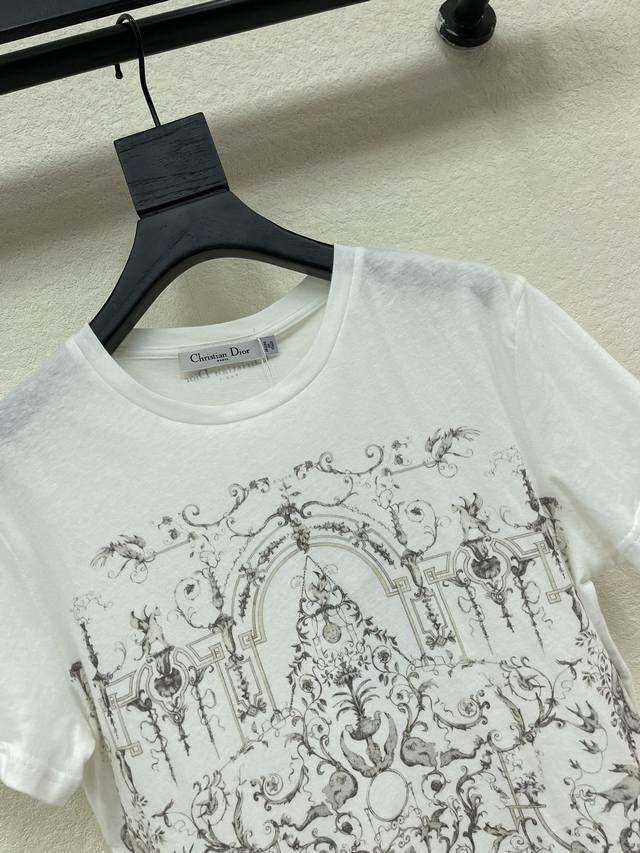 Dio*25 New Castle Floral Lucky Star Pattern Short-Sleeve T-Shirt. Made of custom-made 100% cotton, high-quality, soft and comfortable. Regular short-sleeve T-shirt cut for a slimming effect. The body is decorated with a large amount of floral, foliage, and architectural elements. Combined with the letter logo on the back neckline, it forms a rich and harmonious design. A unified and elegant style with a strong sense of design. Stylish and eye-catching whether worn alone or layered. Sizes: S, M, L, A.