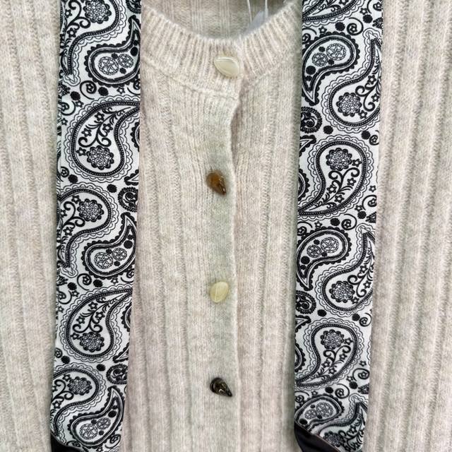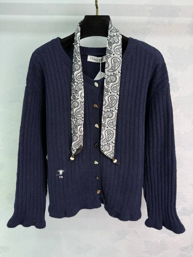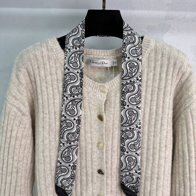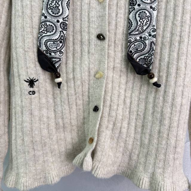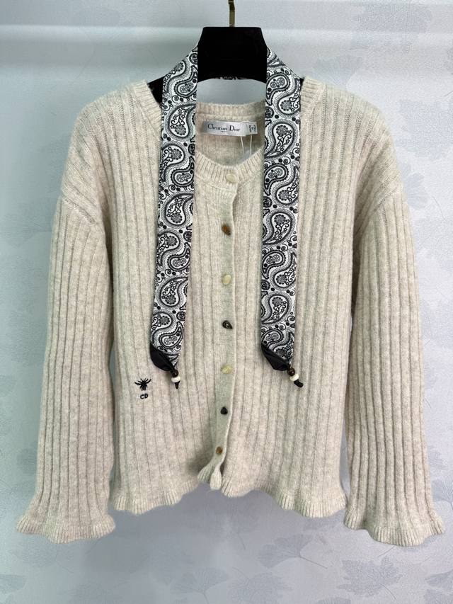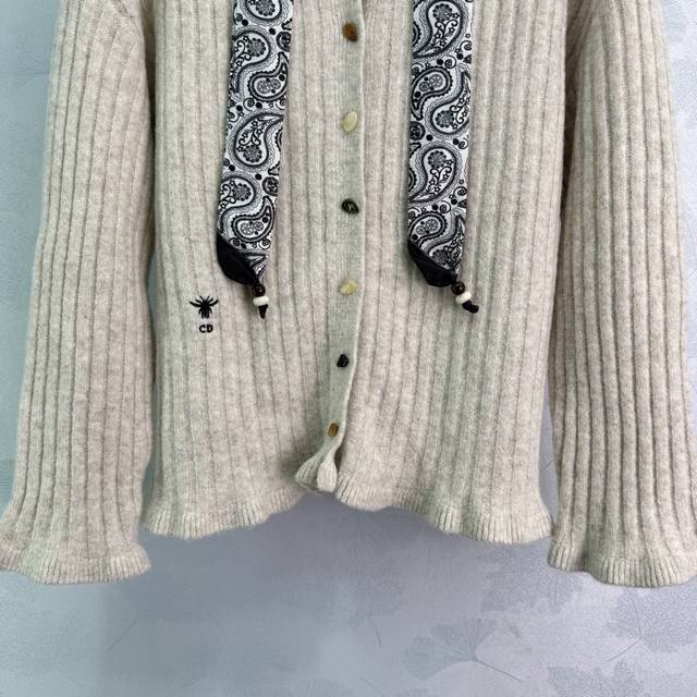 Dio*25 new fall/winter round-neck knitted cardigan with a bohemian pattern and tie design, accented with shell buttons. Soft and comfortable fabric. Logo embroidery on the right side highlights the brand's character, showcasing a retro style that adds an elegant touch. Available in 2 colors and 3 sizes (Sml