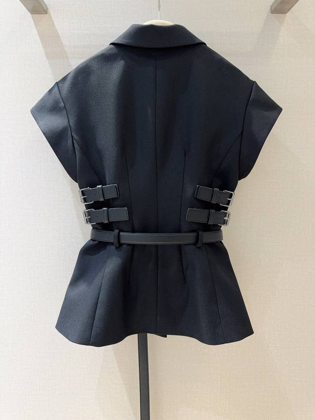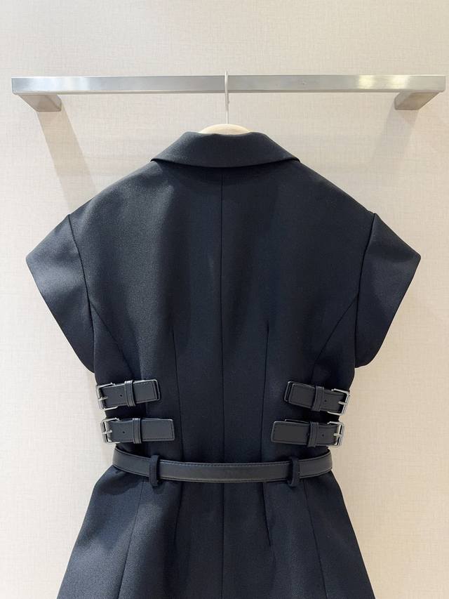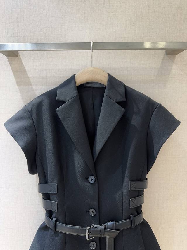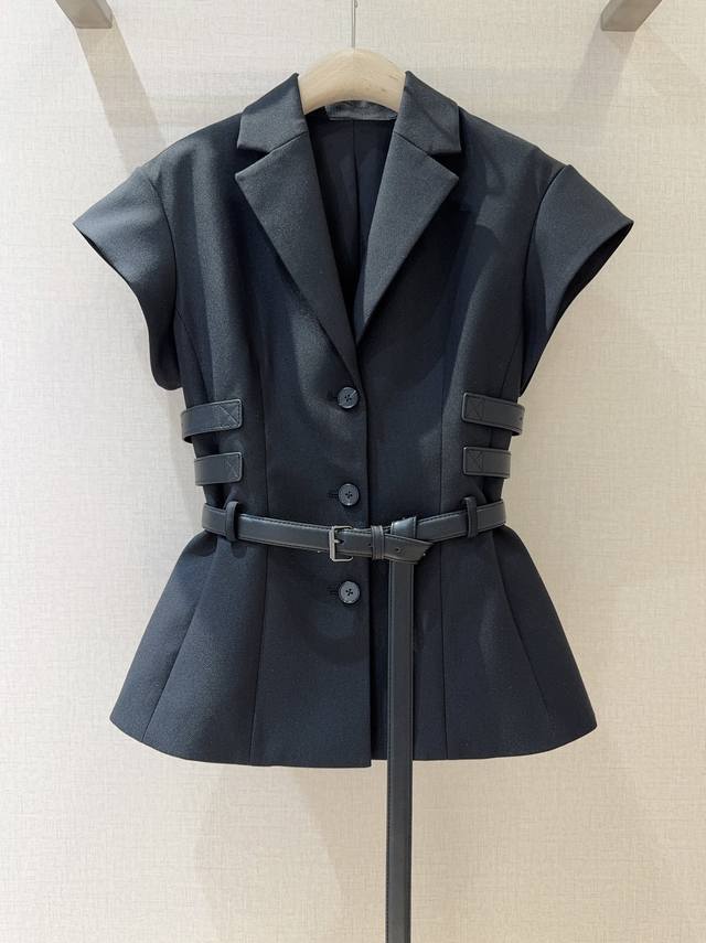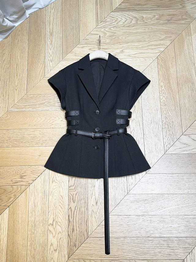 Black short-sleeved suit, made of 100% Polyester, neat lapel with personalized belt, simple yet cool details. The waist design outlines the figure, and the casual long belt adds fashion tension, making it easy to create a fashionable aura.