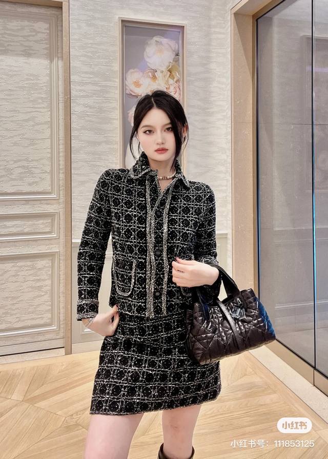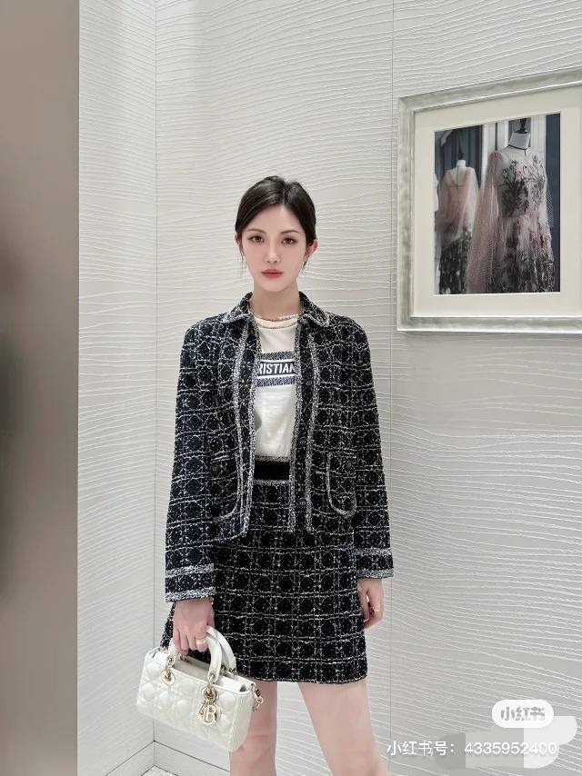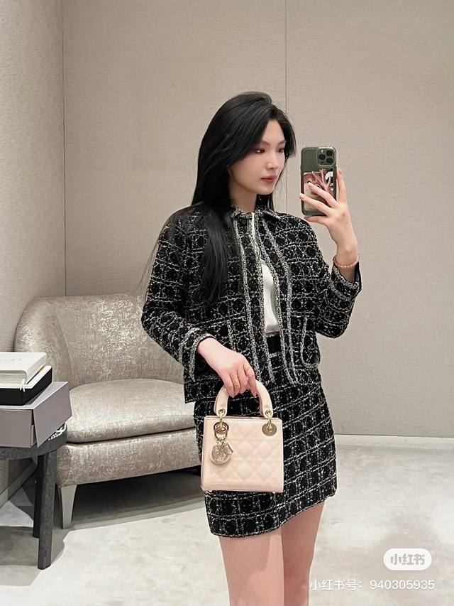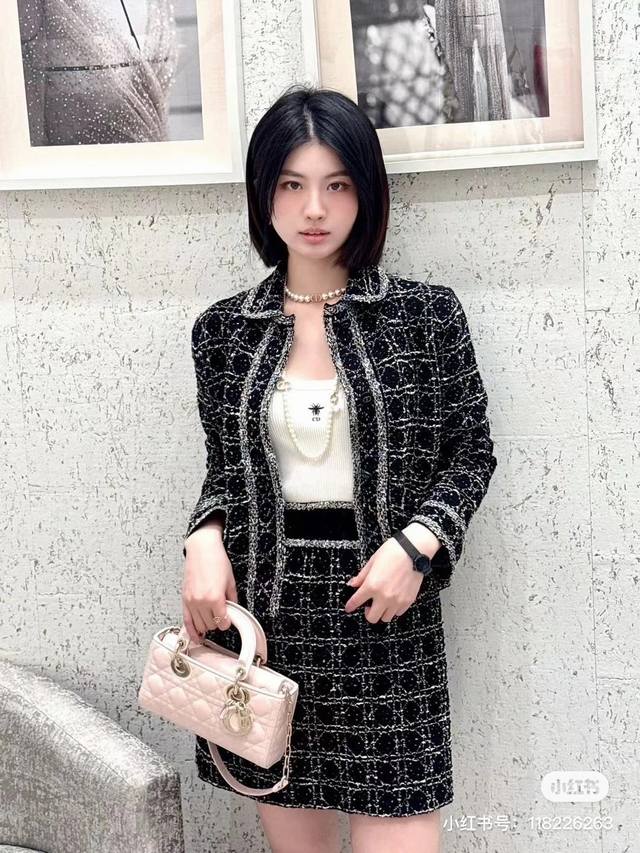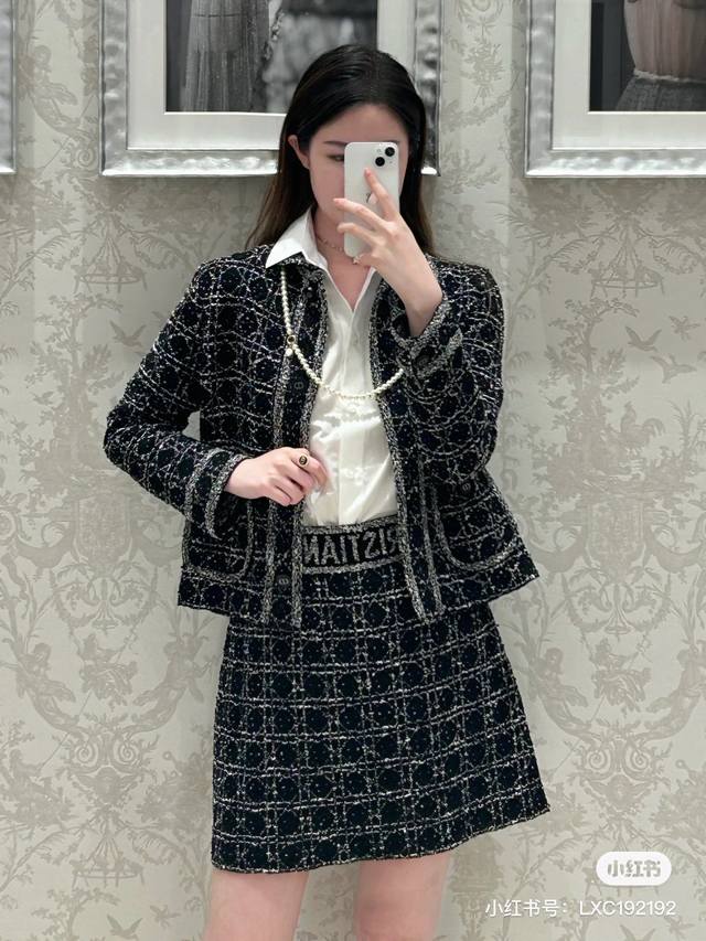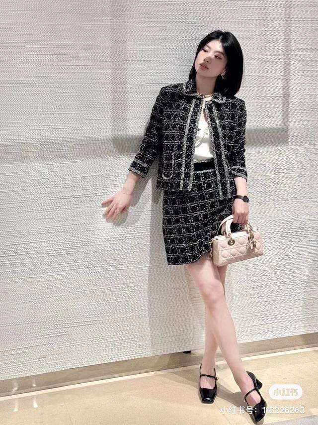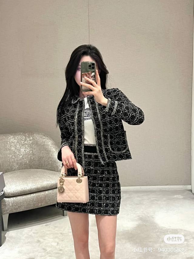 Dio's new high-end custom-made, D-brand diamond-patterned tweed blended knit fabric, Cd logo buttons, double-pocket lapel, short long-sleeved knitted jacket! Black, size M: chest 90, sleeve length 56, length 49